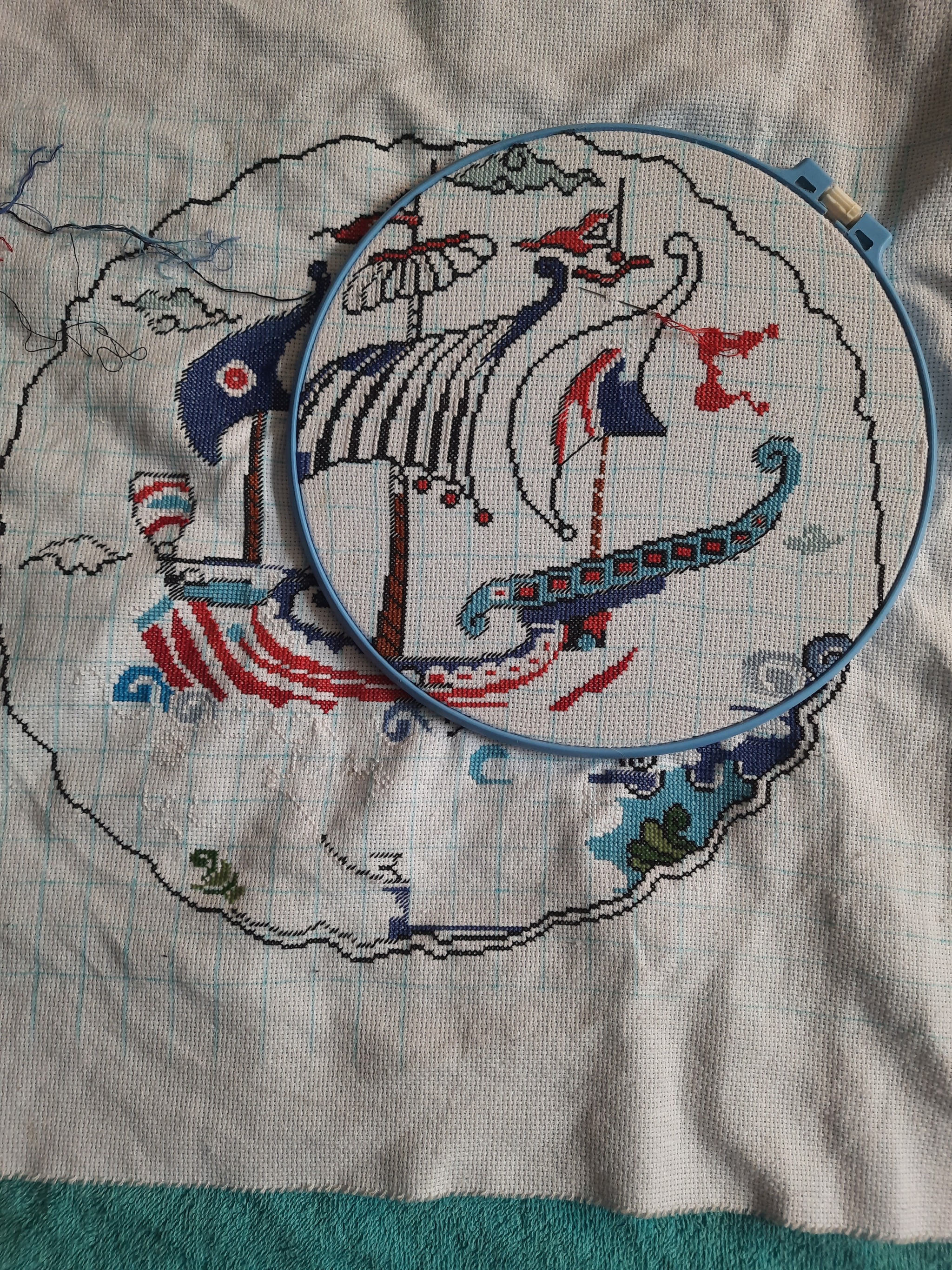 Я не люблю вышивать шерстью, это как-то мне сложно даётся, но главная загвоздка оказалась в том, что мы с хозяйкой вышивки делаем крестики в разные стороны. В процессе мне пришлось мимикрировать и внимательно следить за тем, куда я тычу иглой. Пару раз я отвлекалась на фильм и приходилось кусочек перевышивать.