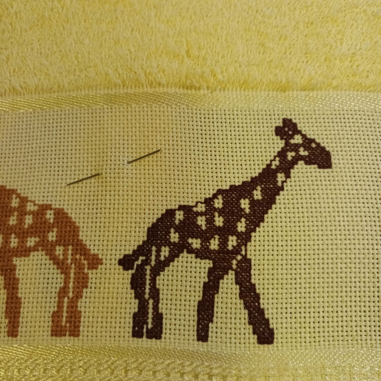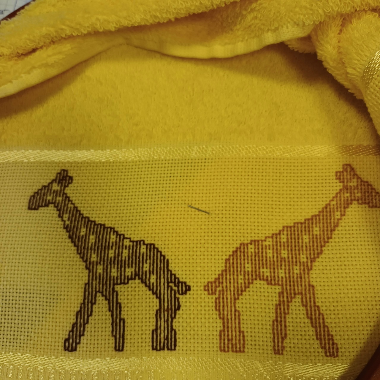 И пример работы. Вышиваю монохромных жирафиков на полотенце. Каждый жираф вышит "в одну нитку" (на самом деле ниток несколько, но шить каждой новой я начинаю от той же точки, где закончила предыдущей, как если бы нить не кончалась).