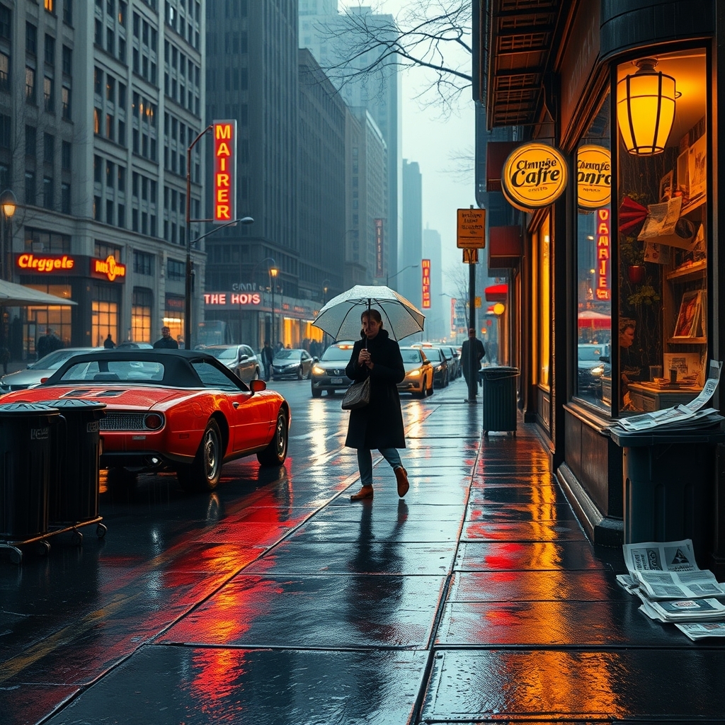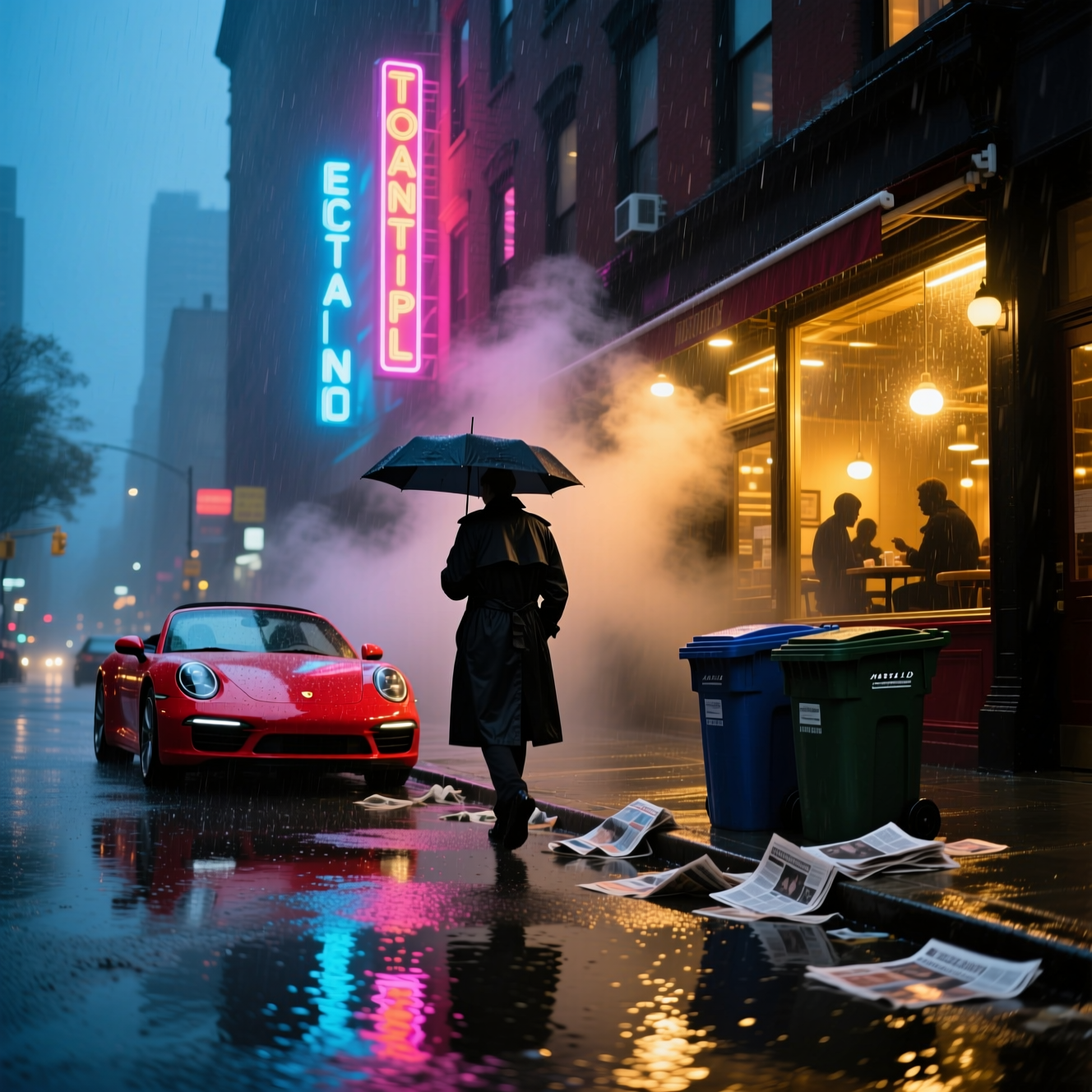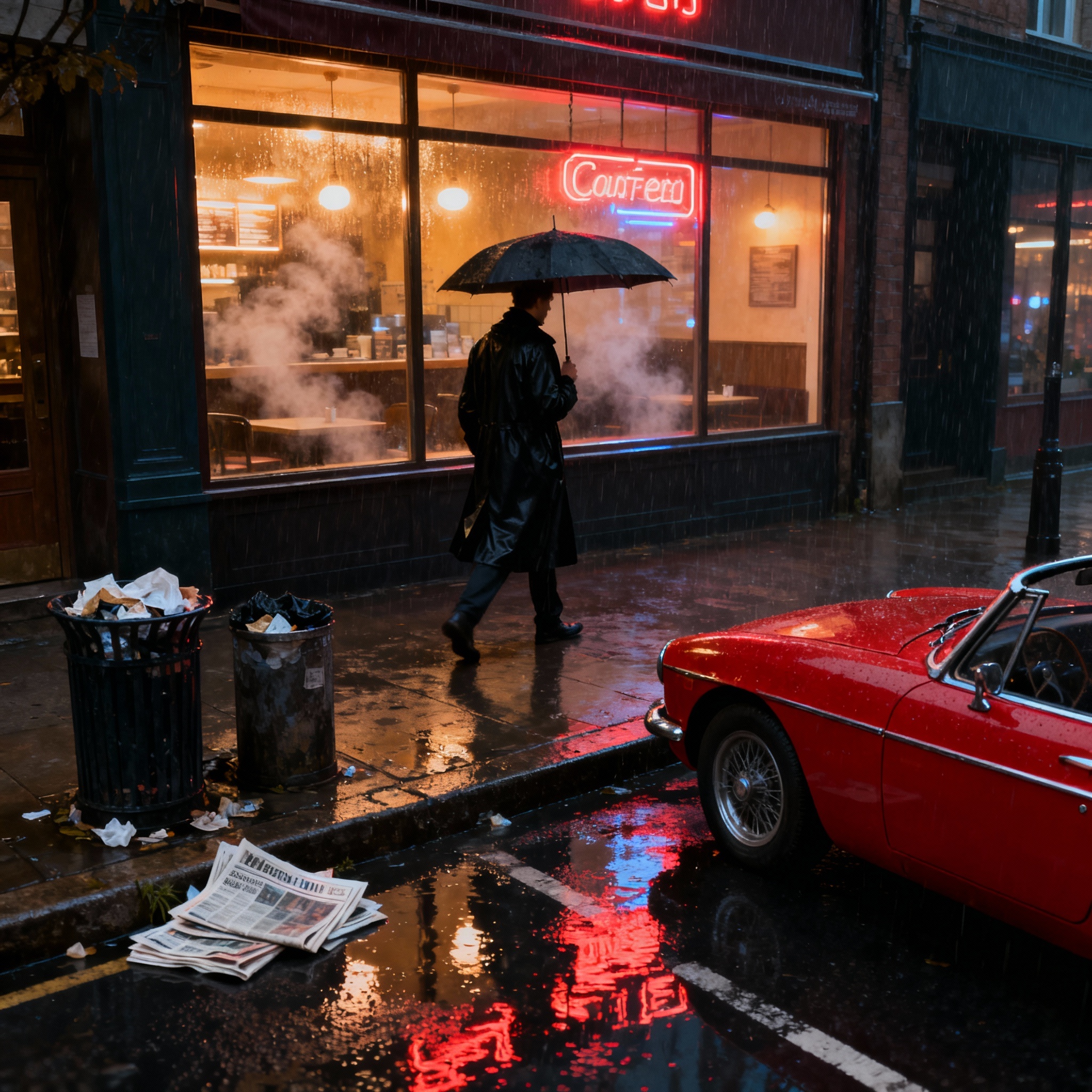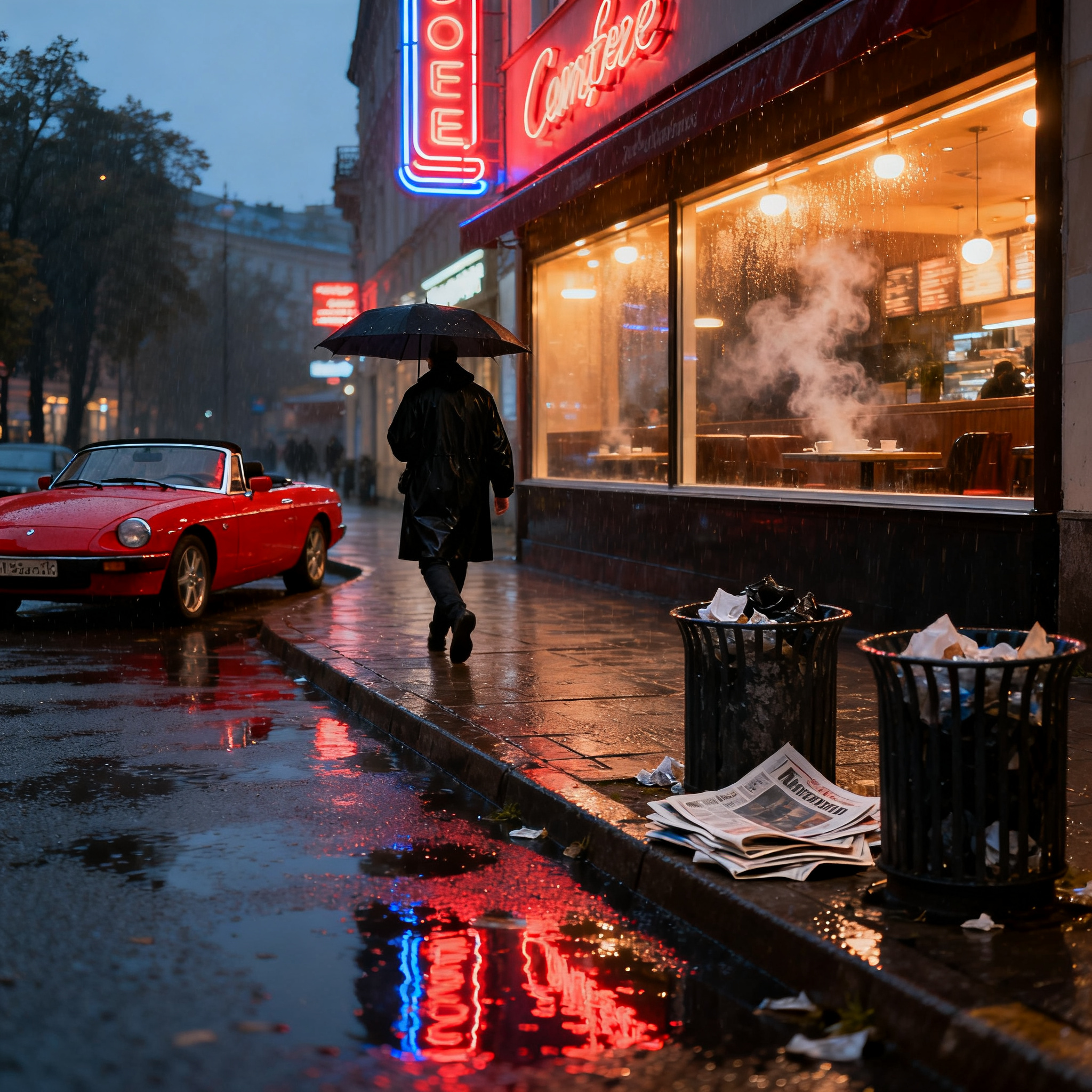 Городская улица в дождливый вечер, мокрый асфальт с отражениями неоновых вывесок, прохожий в чёрном плаще с зонтом, красный кабриолет у тротуара, витрина кафе с тёплым светом и паром на стекле, урны с мусором, мокрые газеты у обочины, реалистичный стиль, высокая детализация, атмосферное освещение.