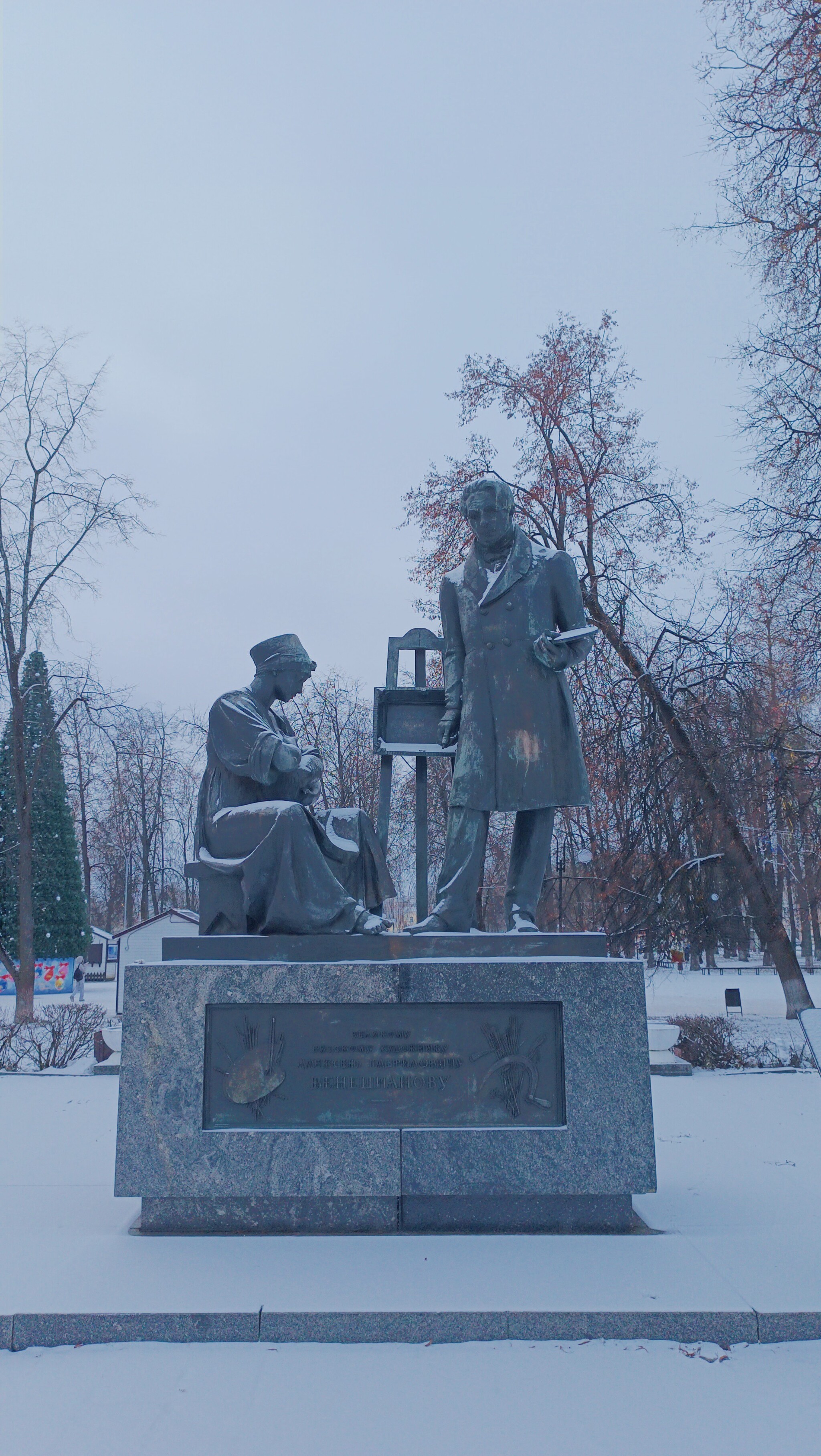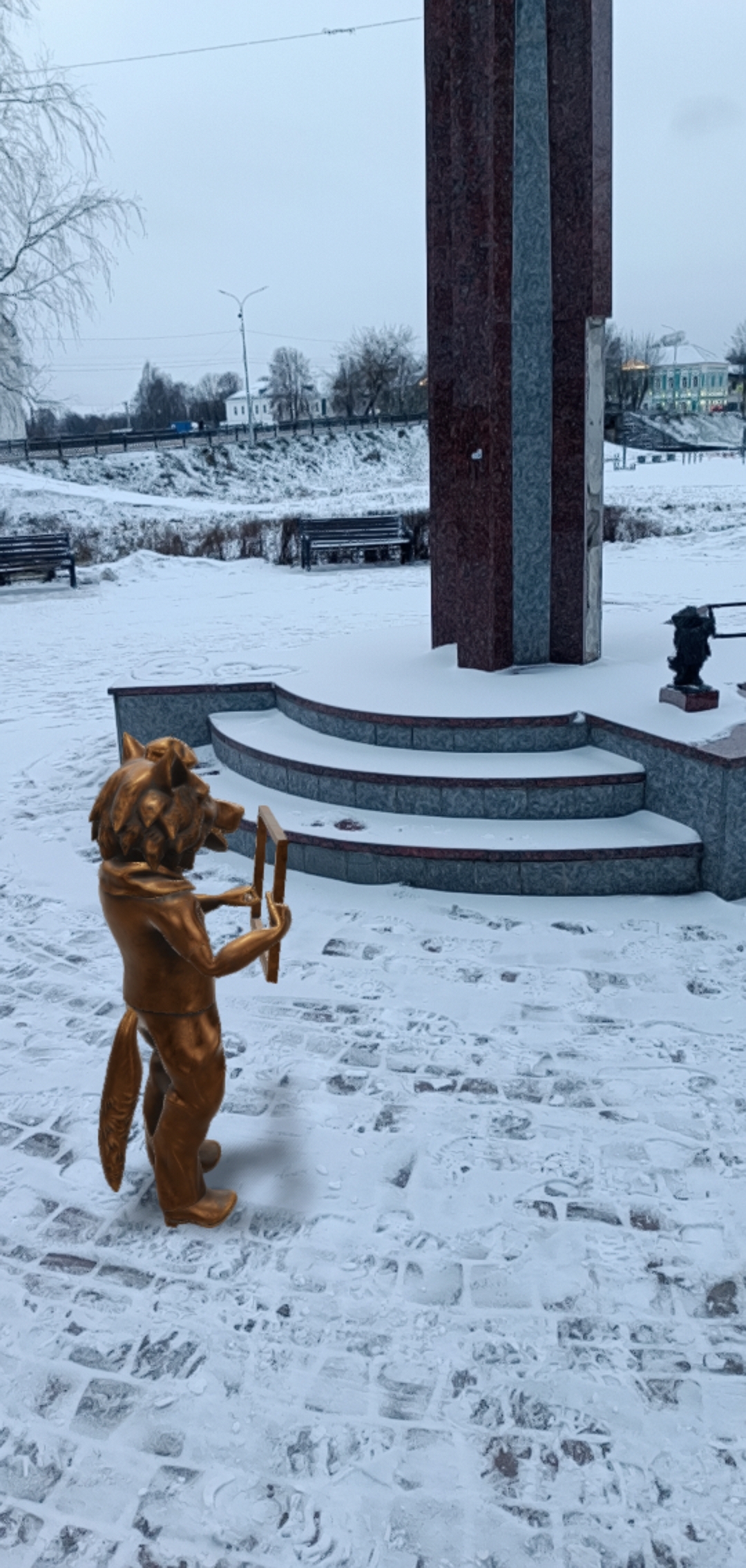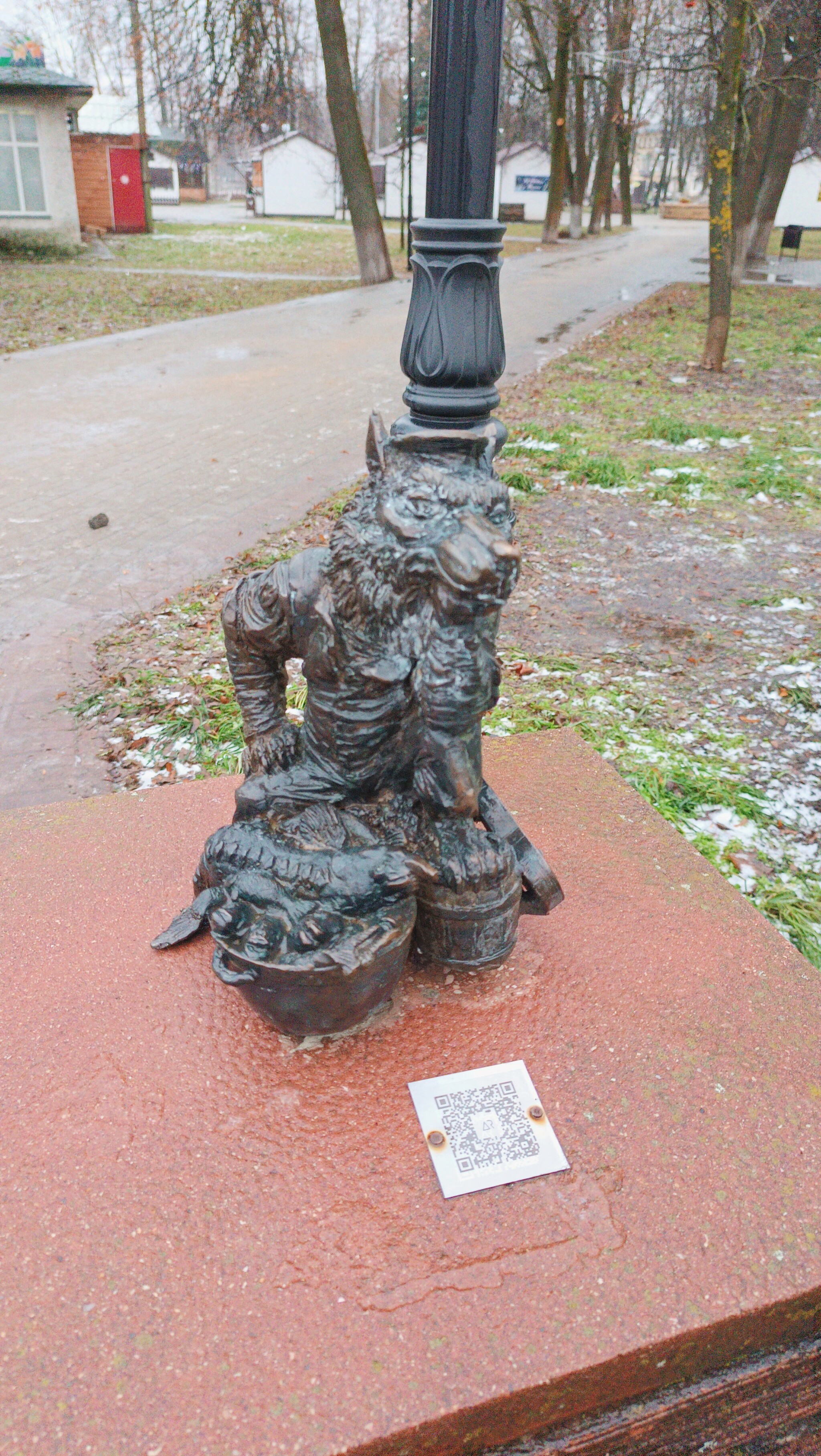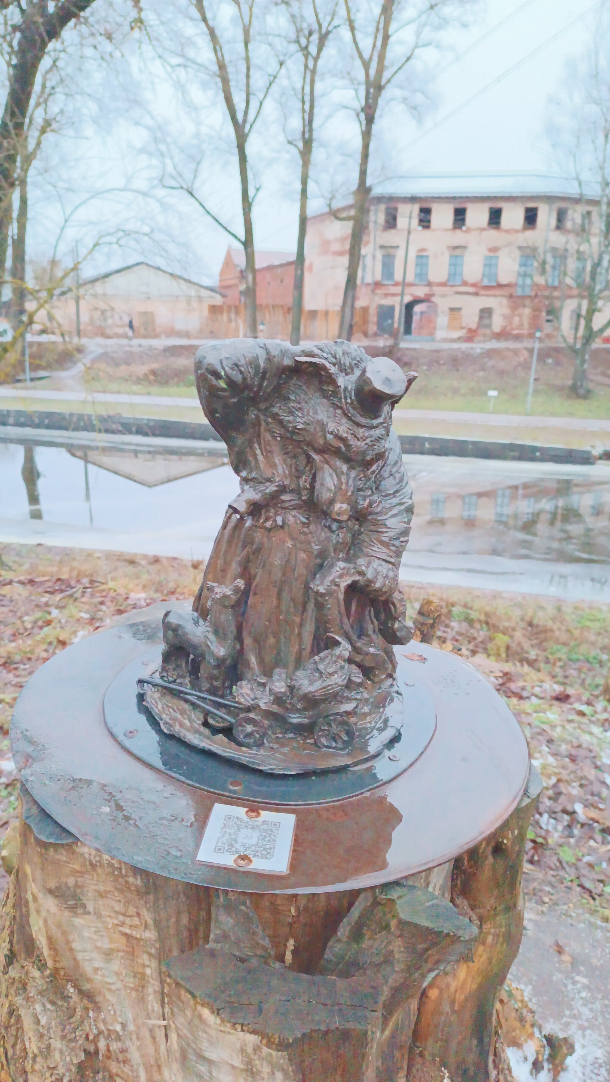Дальше памятники местные различные, тут и Екатерина, и Пётр, и товарищ Венецианов. Есть серия небольших скульптур волчков различных (помещик, амур, футболист, художник и т.д.) - они "снабжены" QR-кодом. При наведении на него появляется у вас волчок соответствующий данной скульптуре и рассказывает немного об истории в своём ключе. Всё бы ничего, но в связи с отключениями интернета только волчок-художник смог поведать мне свою историю😂