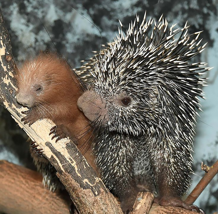 Ещё одна причина спуститься «с небес» на землю – это роды. После очень долгой (для 3-4-килограммового грызуна) беременности в 200 с лишним дней у самки появляется на свет всего один детёныш. Игл у него в этот момент ещё нет, зато лазать по деревьям он может практически сразу после рождения. Так что свежесформированная ячейка дикообразьего общества в лице мамы и детёныша немедленно лезет в родную древесную крону, где они останутся вдвоём вплоть до рождения у самки следующего малыша.