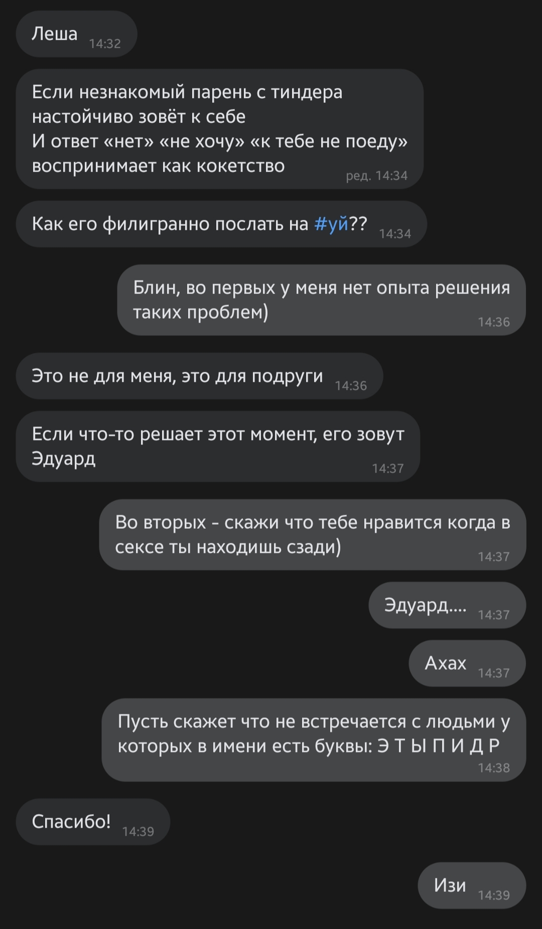 Есть ещё одна очень интеллектуальная переписка. Ее суть в том, что она ехала в автобусе, а парень рядом (в машине) опустил окно, достал болт и начал наяривать) она снова спрашивала что ей делать в такой ситуации)