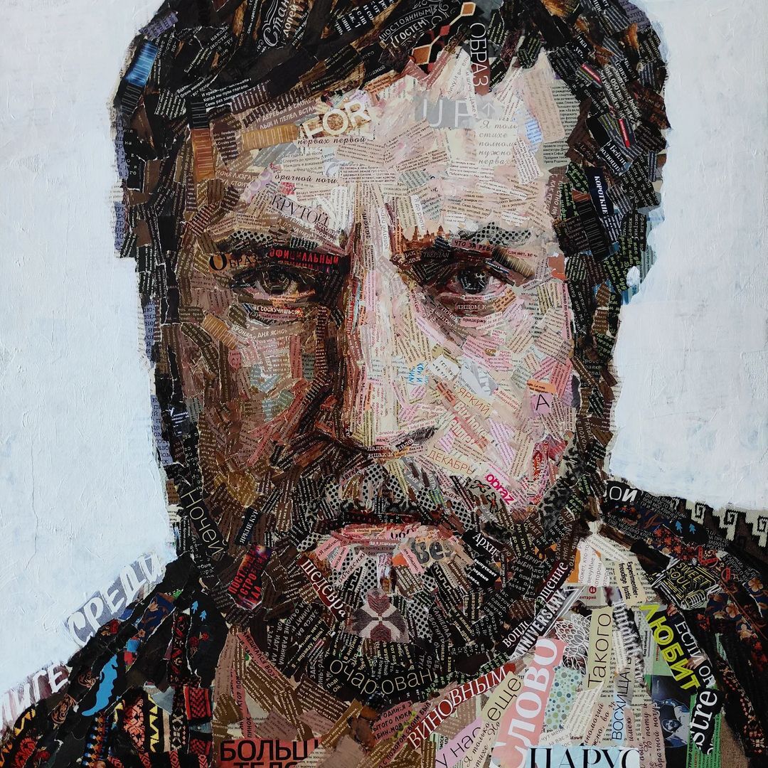 Холст, фрагменты газет и журналов, стихи поэта, масло. 75х75 см. Июль 2022