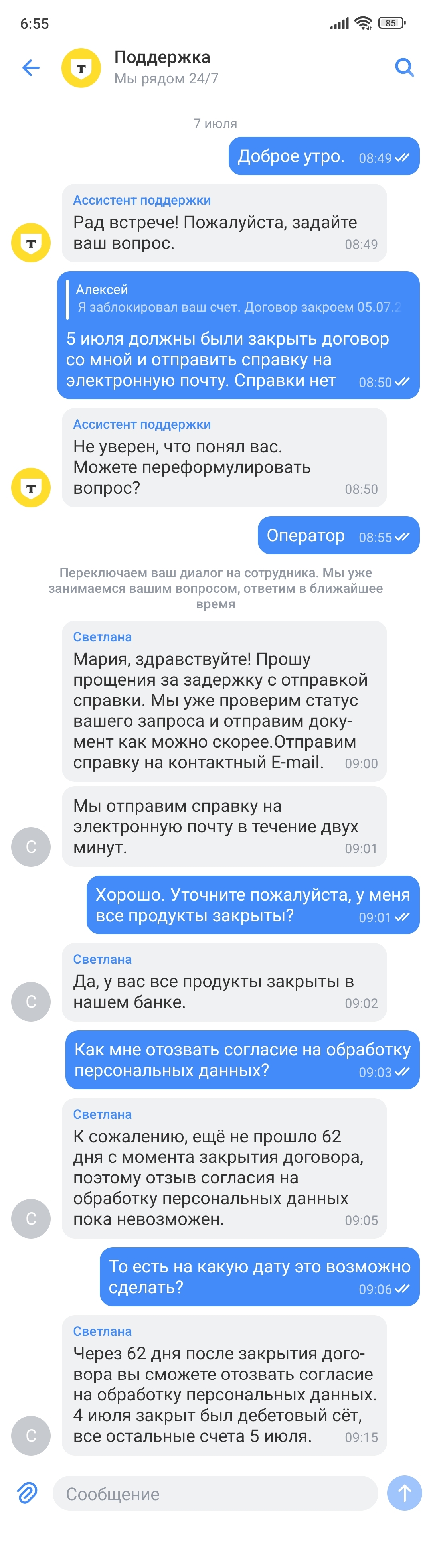 оо, а тут вы быстрее отвечаете чем в приложении :D и оператор тупо отключается после одного ответа. ммм, и списла за обслуживание картой которой не пользуюсь :D вроде с одной стороны норм банк, ну а с другой связываться вообще не хочется :D