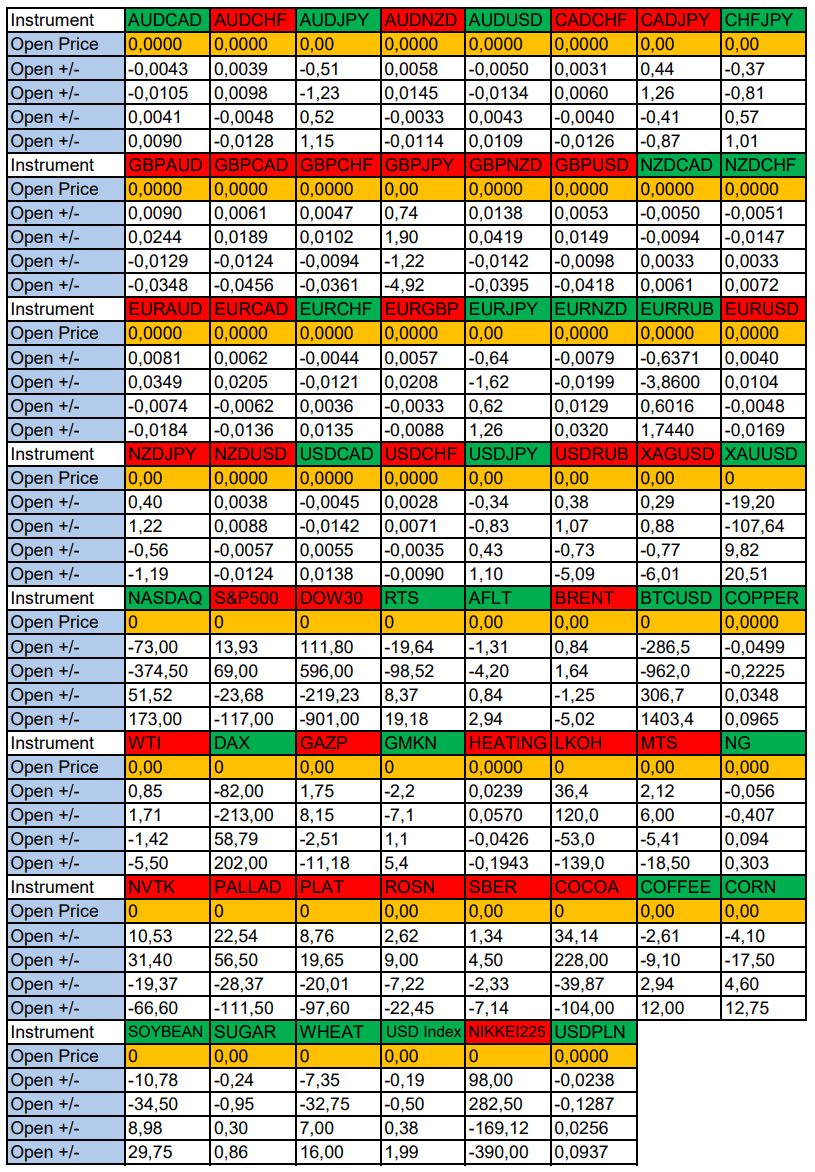 Весь перечень анализируемых активов указан ниже в общем количестве 62 инструмента. Здесь Вы найдете активы рынка Форекс, популярные активы Московской биржи, не менее популярные активы Чикагской биржи СМЕ и мажор криптовалютного сегмента - Биткоин, за которым следуют все альткоины.