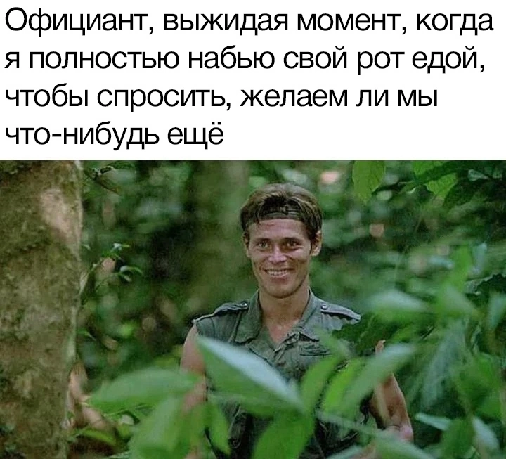 3411 VerhovniyMemolog 3 года назад Юмор для всех и каждого Выжидание Телеграм - Три мема внутривенно Юмор Картинка с текстом Мемы Официанты Уиллем Дефо Фильм Взвод Еда 43 2 2 1 Ещё 0