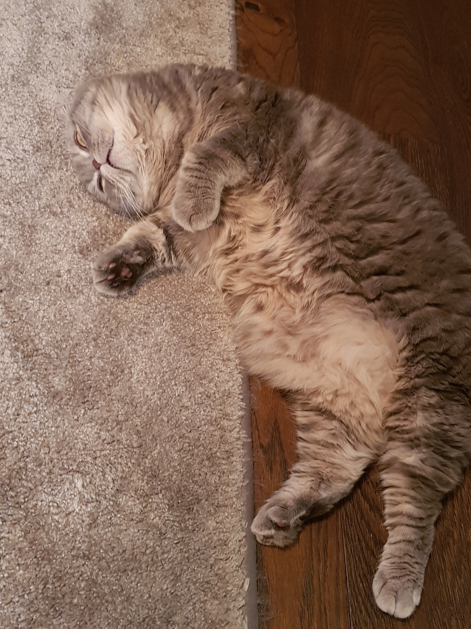 После похода к ветеринару на уколы. Боролась из последних сил, на всякий случай покусала всех, до кого смогла дотянуться. Дома, не веря своему счастью, выпала из реальности, наверное, думает, что всех победила