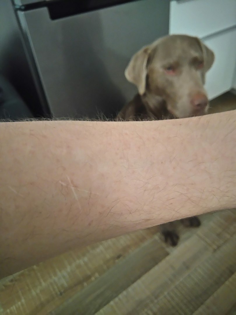 Теперь обратите внимание на форму шрама. Он не зря как крестик выглядит, ибо это никакой не крестик, это буква. Это буква "Х". Вы представляете, как я был тогда рад, что не дописал слово до конца? Представляете, как рад я сейчас, что я не хожу со шрамом из слова "хуй" на руке? Даже пес на фотке на меня как на дебила смотрит!