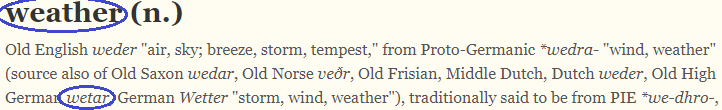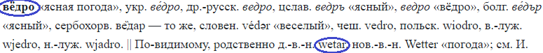 herzog5 Лига охотников за грозами Вёдро Происхождение 3 года назад https://www.etymonline.com/word/wether https://lexicography.online/etymology/vasmer/в/ведро Ведро Погода Ещё 0