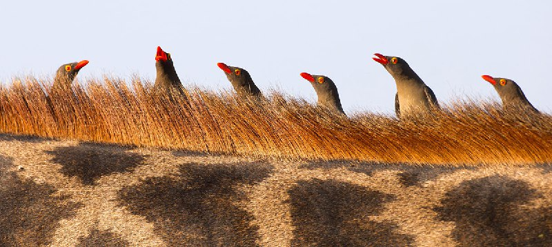 6 красноклювых буйволовых скворцов (волоклюев) присели на гриву жирафа, чтобы передохнуть после долгого перелёта и заодно полакомиться насекомыми, которые в изобилии водятся в шерсти великана саванны
