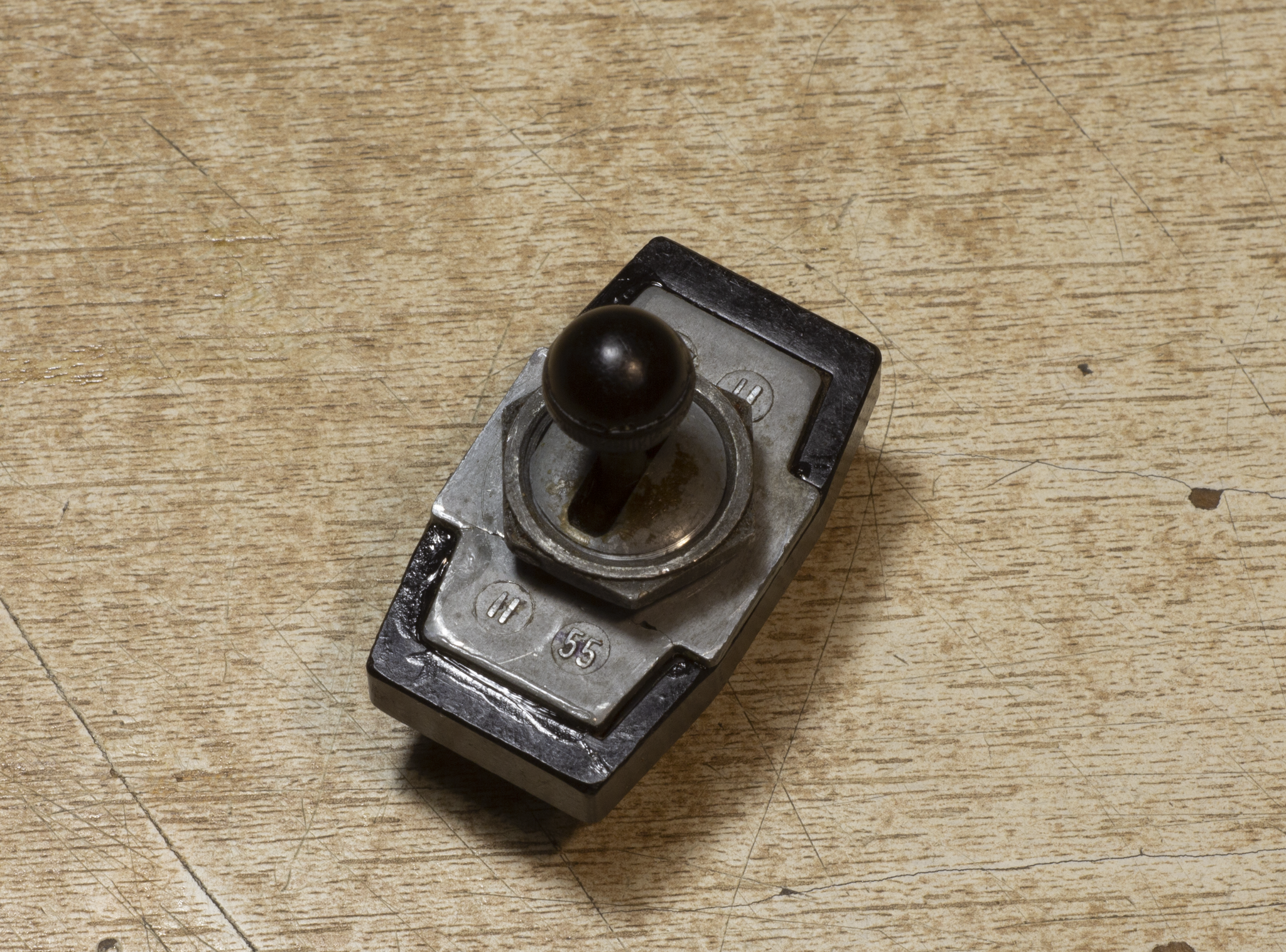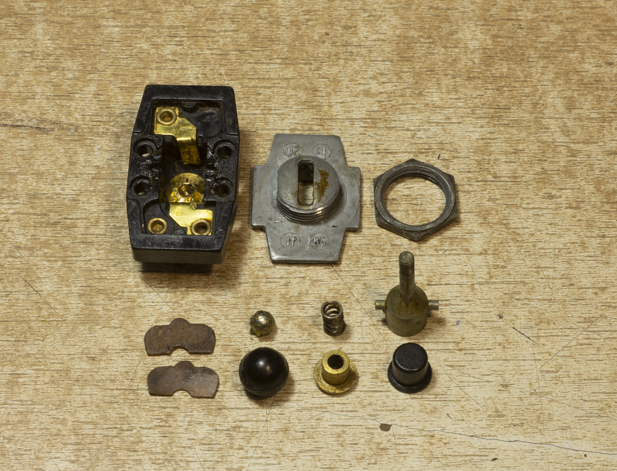 Корпус данного конкретного переключателя сделан из бакелита, если его намочить, появляется характерный запах. Впрочем, в интернете встречаются и более свежие варианты, с пластиковым корпусом.