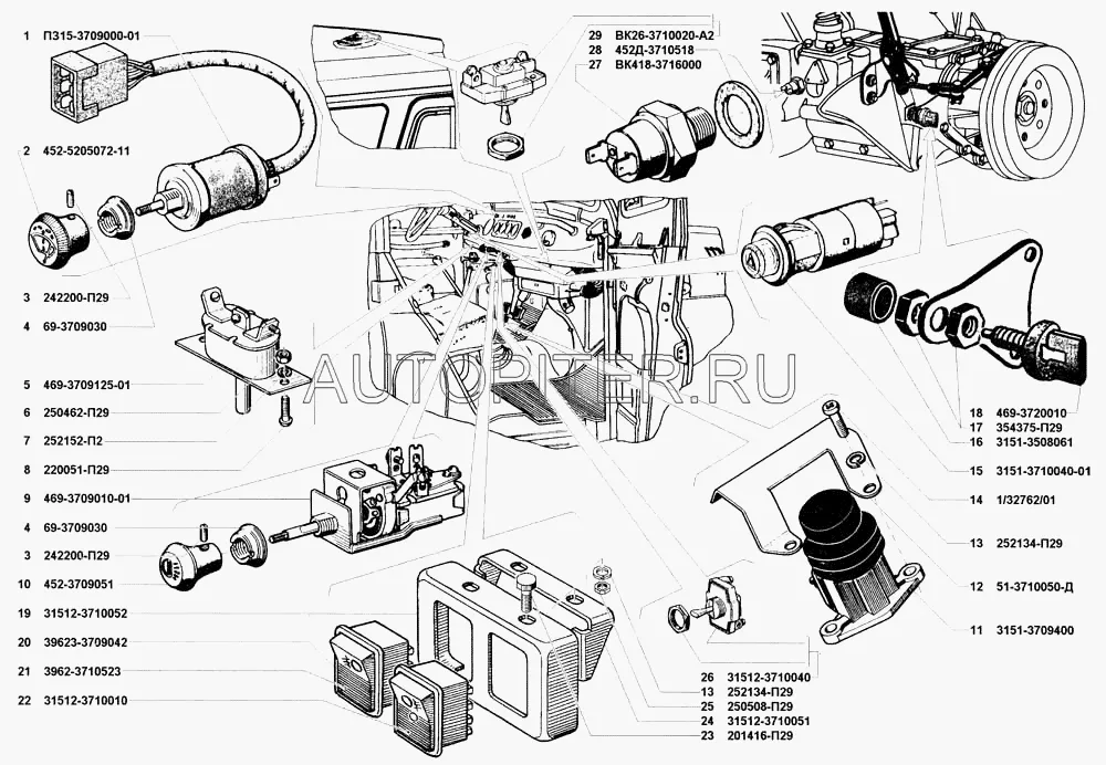 Наверное, самое частое применение этого переключателя - для переключения мощности отопителя на УАЗах. Вон он, внизу картинки чуть правее центра.