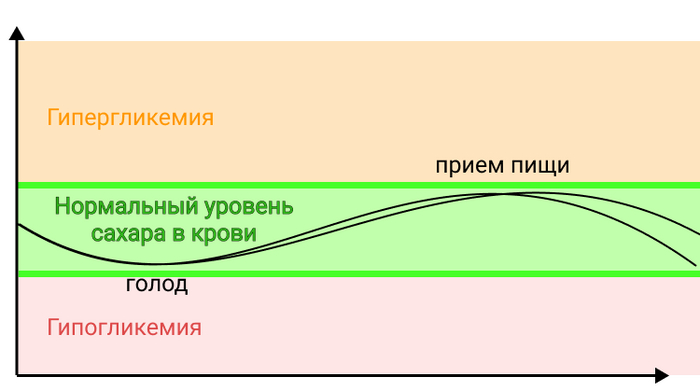 Тут нам хотят изобразить, как прием углеводов выбивает нас из гомеостаза глюкозы и загоняет сперва в гипер, а затем в гипогликемию, при который мы и ощущаем слабость, голод и желание снова съесть что-то углеводное.