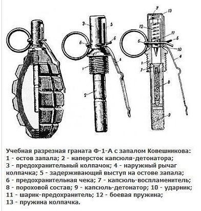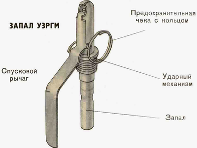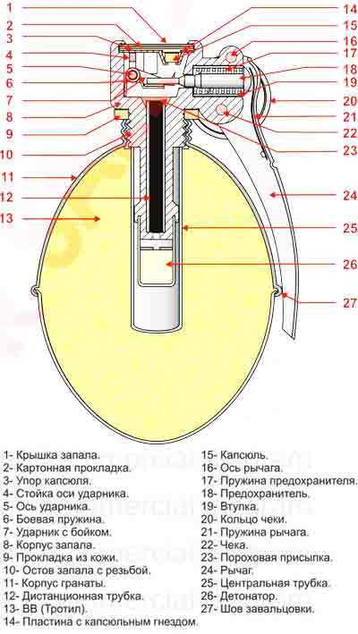 В зависимости от конструкции, запал гранаты включает запальную трубку с капсюлем и детонатором, а также может включать в себя пружинный механизм с бойком, чекой и спусковой скобой. https://ru.m.wikipedia.org/wiki/%D0%93%D1%80%D0%B0%D0%BD%D0%...