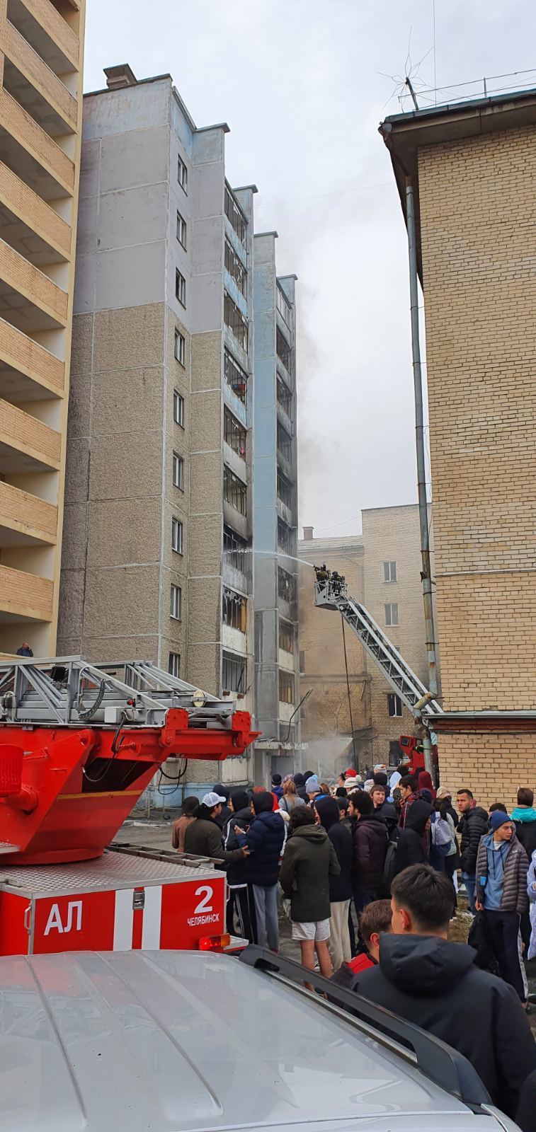 Очевидцы также сообщают, что после взрыва начался пожар в соседнем общежитии, жильцов эвакуировали, сейчас они стоят на улице.