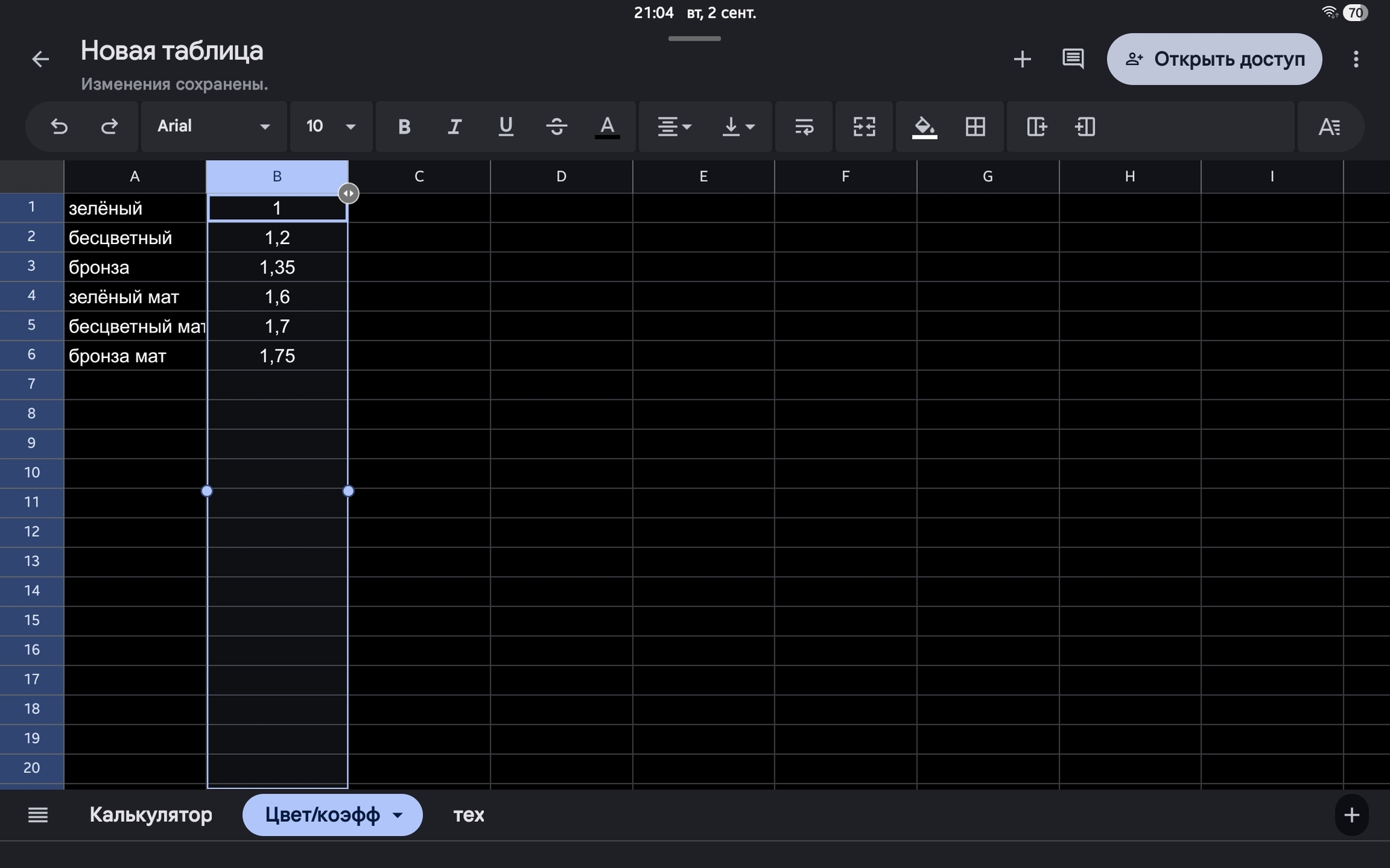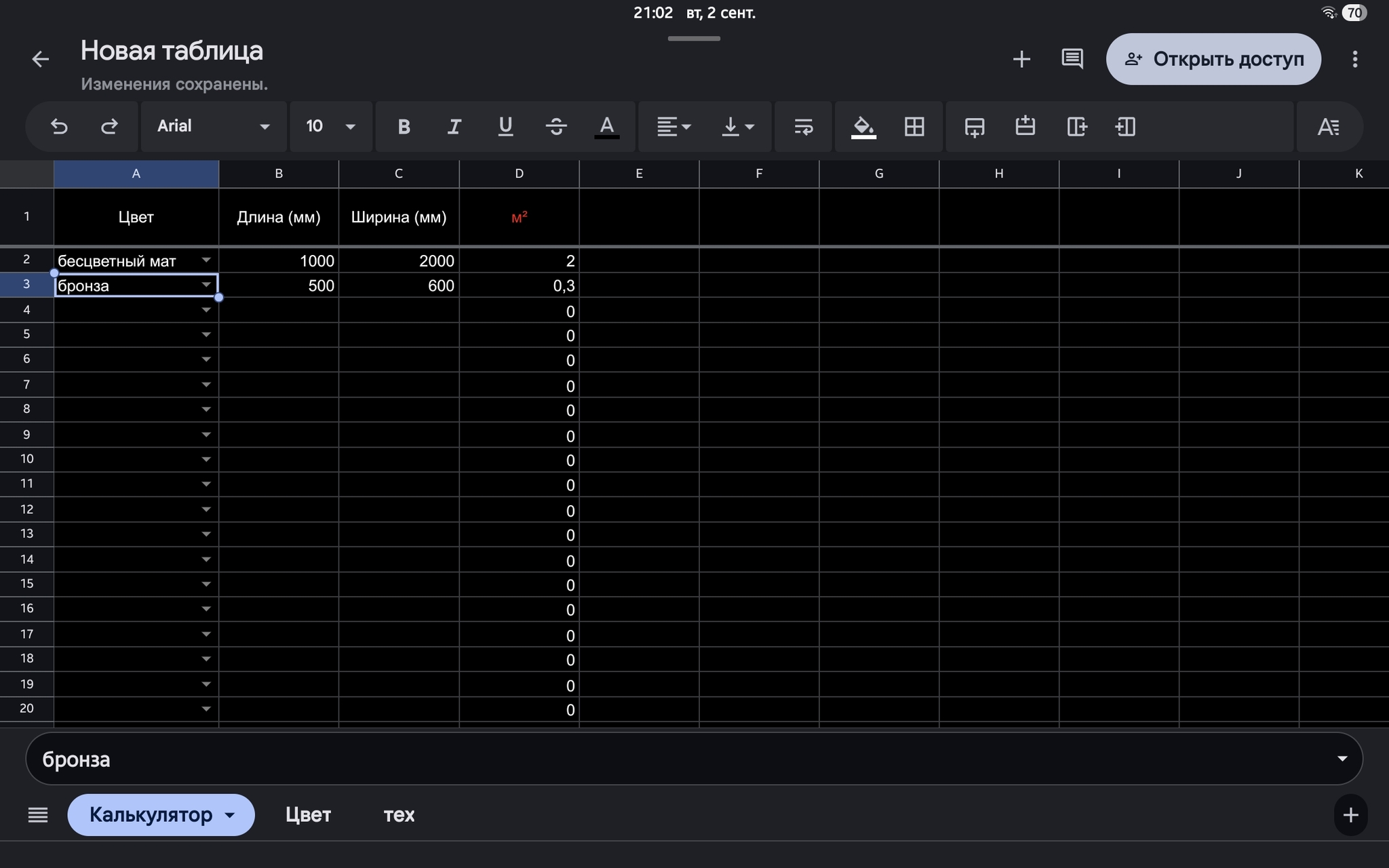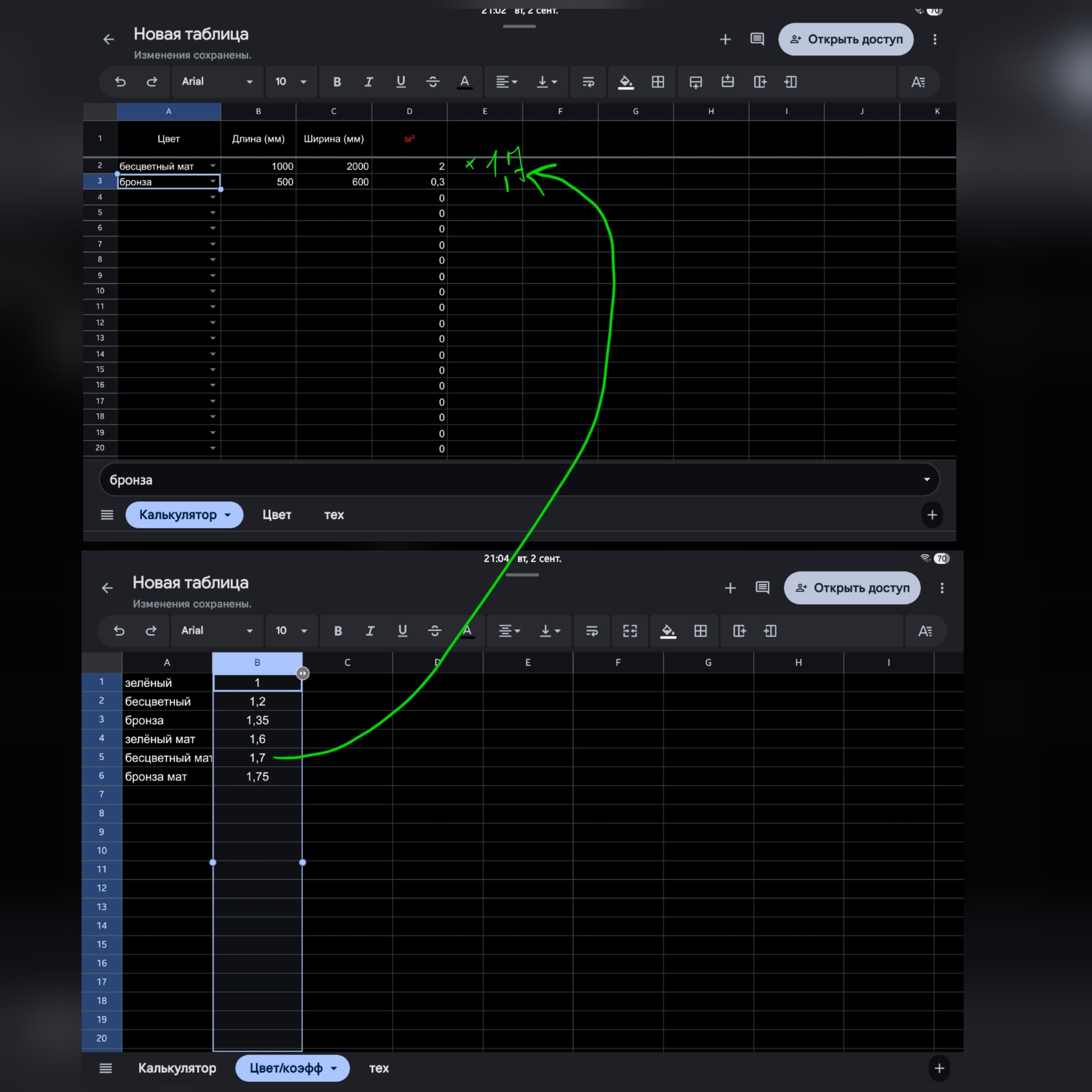 Длина * Ширина * Цвет (с записанными в отдельном листе множителями)