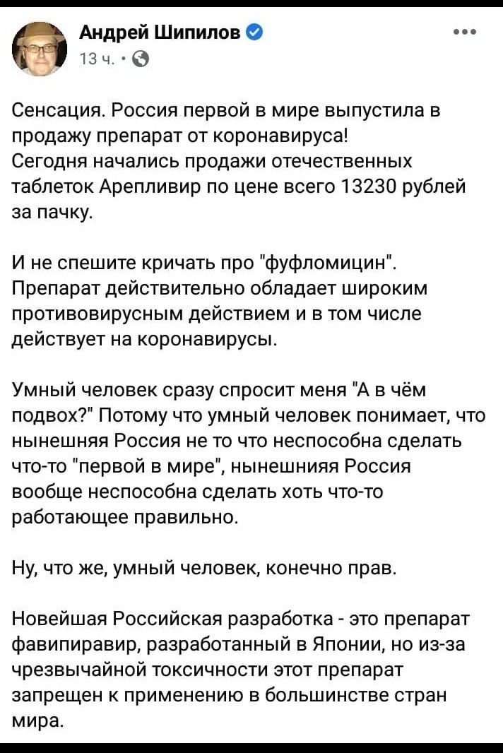 Timonich Взято из ВКонтакте 5 лет назад Я, конечно, исследования не проводил, но разве эта новость кого-нибудь может удивить? Или есть тут те, кто выложит 13к за эти чудо таблетки? Вакцина Обман ВКонтакте Коронавирус Длиннопост Ещё 0