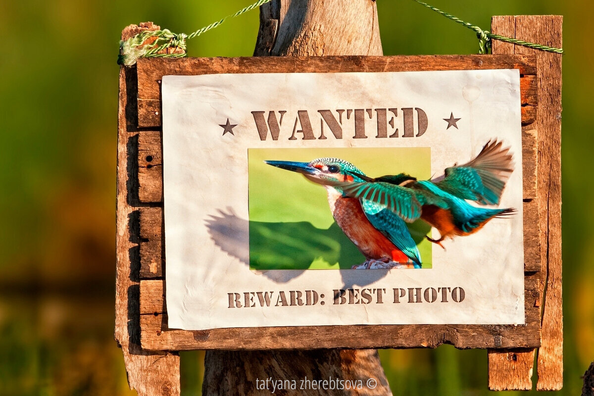 Саму табличку мы сделали из старого овощного ящика, а фото взяли этого же зимородка, снятое несколькими днями ранее.