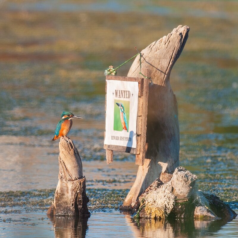 Я была бы рада хотя бы одному снимку, где он был бы запечатлен рядом с табличкой. Но такой реакции на известие о его "розыске" я не ожидала. Зимородок сидел на всех возможных местах на коряге и табличке.