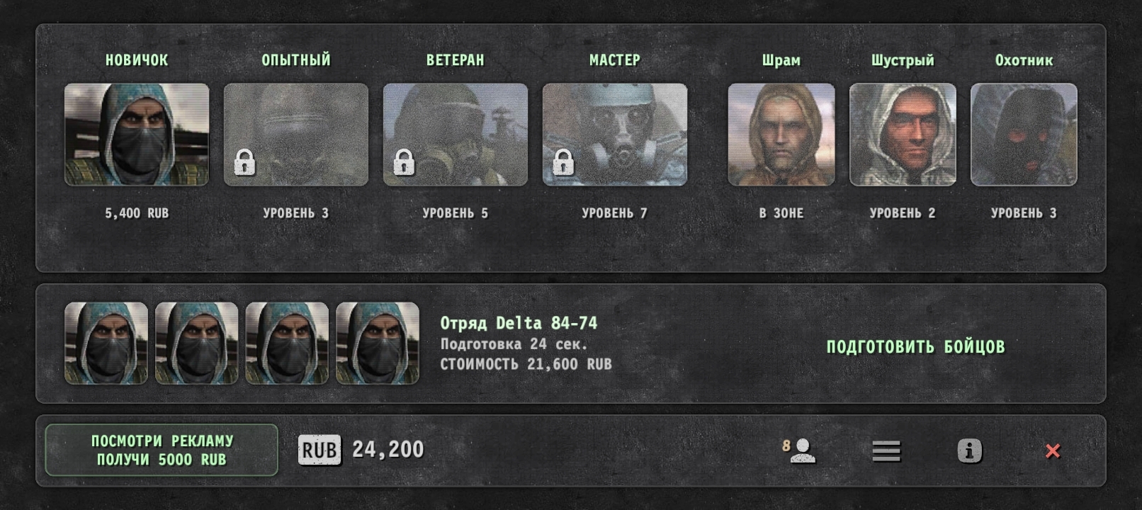 А вот и тот момент, когда бойца можно улучшить, с поднятием до третьего уровня группировки, каждого можно улучшить за деньги. Которые зарабатываются с помощью боёв с другими группировками, поиском артефактов и их продажи, а так же, с помощью выполнения заданий других группировок.