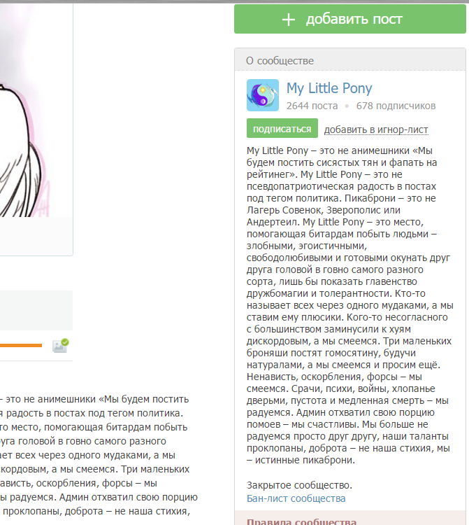 Ты совершенно не понимаешь в чем суть сообщества My Little Pony. My Little Pony – это не анимешники «Мы будем постить сисястых тян и фапать на рейтинег». My Little Pony – это не псевдопатриотическая радость в постах под тегом политика. Пикаброни – это не Лагерь Совенок, Зверополис или Андертеил. My Little Pony – это место, помогающая битардам побыть людьми – злобными, эгоистичными, свободолюбивыми и готовыми окунать друг друга головой в говно самого разного сорта, лишь бы показать главенство дружбомагии и толерантности. Кто-то называет всех через одного мудаками, а мы ставим ему плюсики. Кого-то несогласного с большинством заминусили к хуям дискордовым, а мы смеемся. Три маленьких броняши постят гомосятину, будучи натуралами, а мы смеемся и просим ещё. Ненависть, оскорбления, форсы – мы смеемся. Срачи, психи, войны, хлопанье дверьми, пустота и медленная смерть – мы радуемся. Админ отхватил свою порцию помоев – мы счастливы. Мы больше не радуемся просто друг другу, наши таланты проклопаны, доброта – не наша стихия, мы – истинные пикаброни.