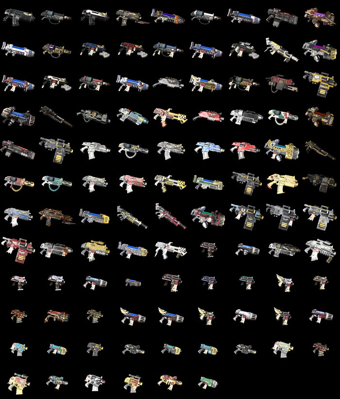 - Более 200 видов и различных типов стрелкового вооружения для хаоситов и лоялистов. ( Болтеры, Болтпистолеты, тяж болтеры, плазма пистолеты, плазмаганы, плазмапушки, мельтапистолеты, мельтаганы, дробовики, лазпушки, гравиганы, огнеметы, комби-оружие, Волкит-винтовки. Комби-щиты) многие отличаются своей механикой, и имеют уникальные способности помимо обычных выстрелов.