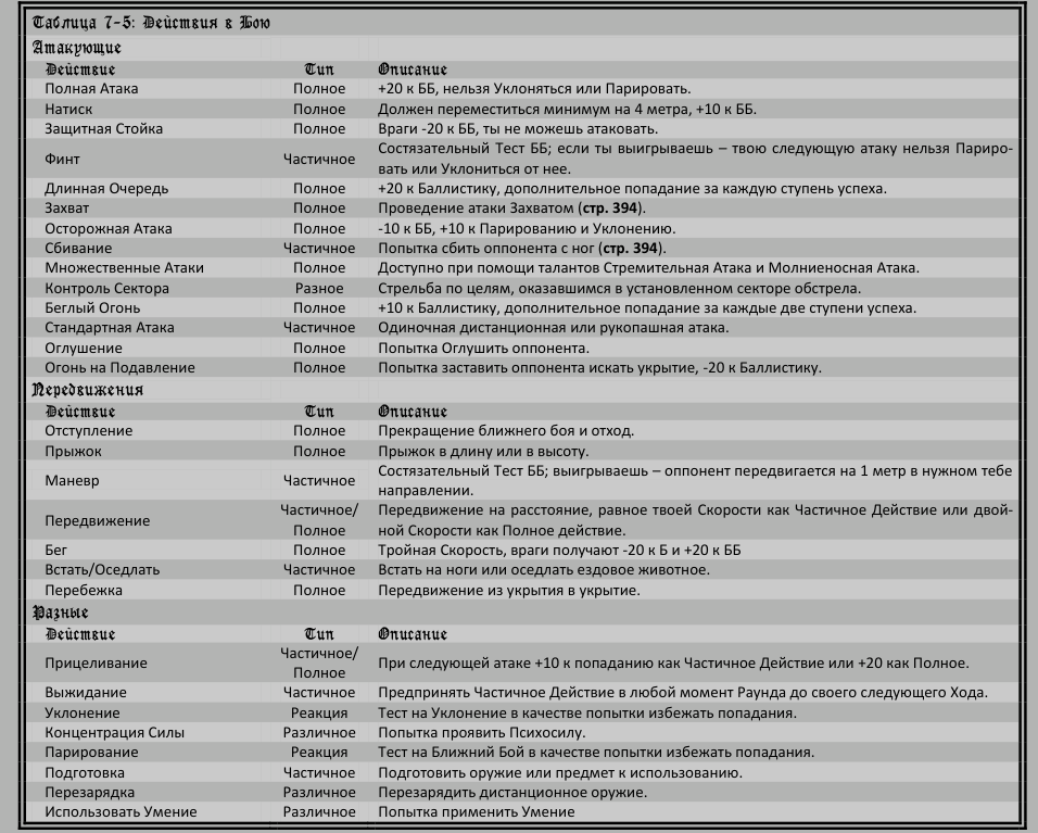 Шаг третий - Персонажи делают ходы. Ну тут уже позамороченней будет. У всех персонажей есть два полу-действия или одно полное действие, которые в свою очередь определяют какие манёвры персонаж может совершить. Т.е. некоторые манёвры, например такой как «Натиск» требует полное действие – т.е. персонаж если и совершает его, то больше ничего кроме как «Натиск» персонаж в своём ходу не делает, то вот допустим если персонаж совершает «Стандартная (или обычная) атака» - то она стоит одно полу-действие, т.е. в свой ход персонаж может совершить две стандартные атаки. Надеюсь, логику объяснил. И там этих манёвров целая таблица, перечислять их все, я не вижу смысла, сами почитаете. И да, один ход — это примерно 5 секунд внутри игрового времени.