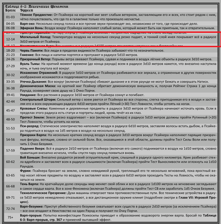 И мы для начала (ну или сразу после, как решит мастер) кидаем д100 на псифеномен, у нас выпадает скажем 13, а это: