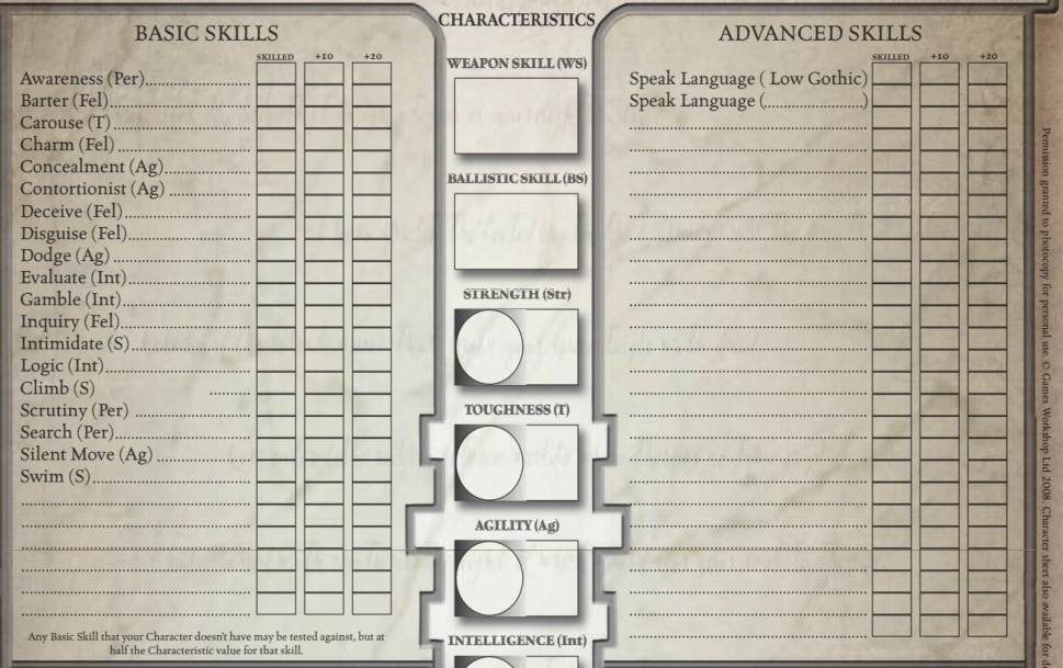Как и любой дом начинается с фундамента так и любая нри начинается со стат чека. Особенность вх40к ролеплей заключается в том, что базовые характеристики персонажей варьируются от 1 до 100 и в случае вахи 40к (ну и соответственно всего семейства) базируется на бросках д10 и д100. На кубах нужно выкинуть меньше проверяемого значения.