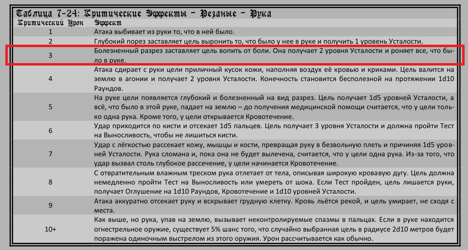 Т.е. допустим у нашего Василия 10 ран. После внезапного манёвра Натиск со стороны сервитора, он нанес Василию в обход брони (для примера мы броню Васи учитывать не будем) скажем 13 режущего урона в руку. 10-13 = -3, Василий получает 3 режущего крит. урона, допустим в левую руку. Что это значит, мы должны открыть соответствующую таблицу режущего урона по руке и видим: