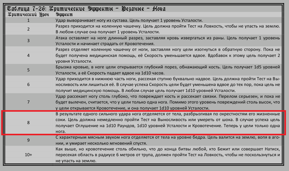 «Болезненный разрез заставляет цель вопить от боли. Она получает 2 уровня Усталости и роняет все, что было в руке.». И скажем в свой ход Василий решил отступить. Сервитор же в свой ход подходит к Василию и совершает первую стандартную атаку и скажем он попадает, нанеся на этот раз Василию скажем 5 крит.урона по левой ноге. И мы вспоминаем что крит. урон имеет накопительное свойство, т.е. мы должны просуммировать ранние 3 единицы с 5, 3+5=8 режущего крит. урона. Т.к. урон пришёлся в левую ногу мы смотрим 8 пункт: