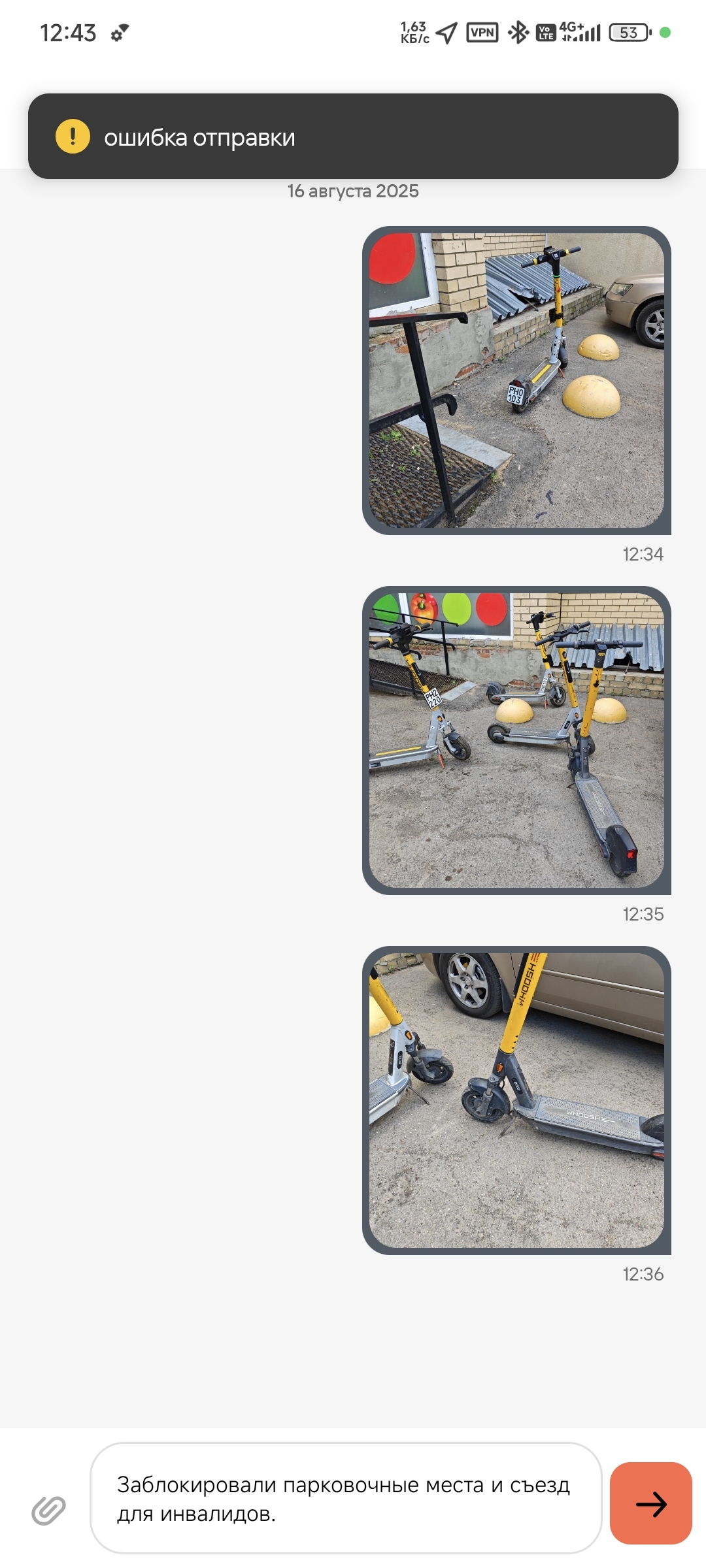 В общем, у меня складывается впечатление, что самокатчики сами пытаются сделать всё, чтобы избавить город от СИМ. Сегодня попытался отправить фотки нарушений, но чат в приложении не работает.
