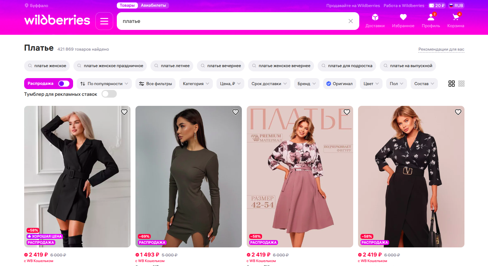 Откройте страницу поиска Wildberries → введите запрос, например, «Платье».