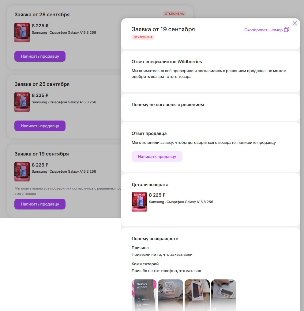 При оформлении возврата я написал, что пришел не тот телефон, что заказывал. В заявке уточнил, что я вскрывал упаковку на ПВЗ, приложил фотографии и видео в качестве дополнительных доказательств, описал состояние телефона. Кроме этого, в чате с продавцом на wilberries я задал вопрос, почему он мне отправил другой телефон. Продавец ответил что-то невнятное.