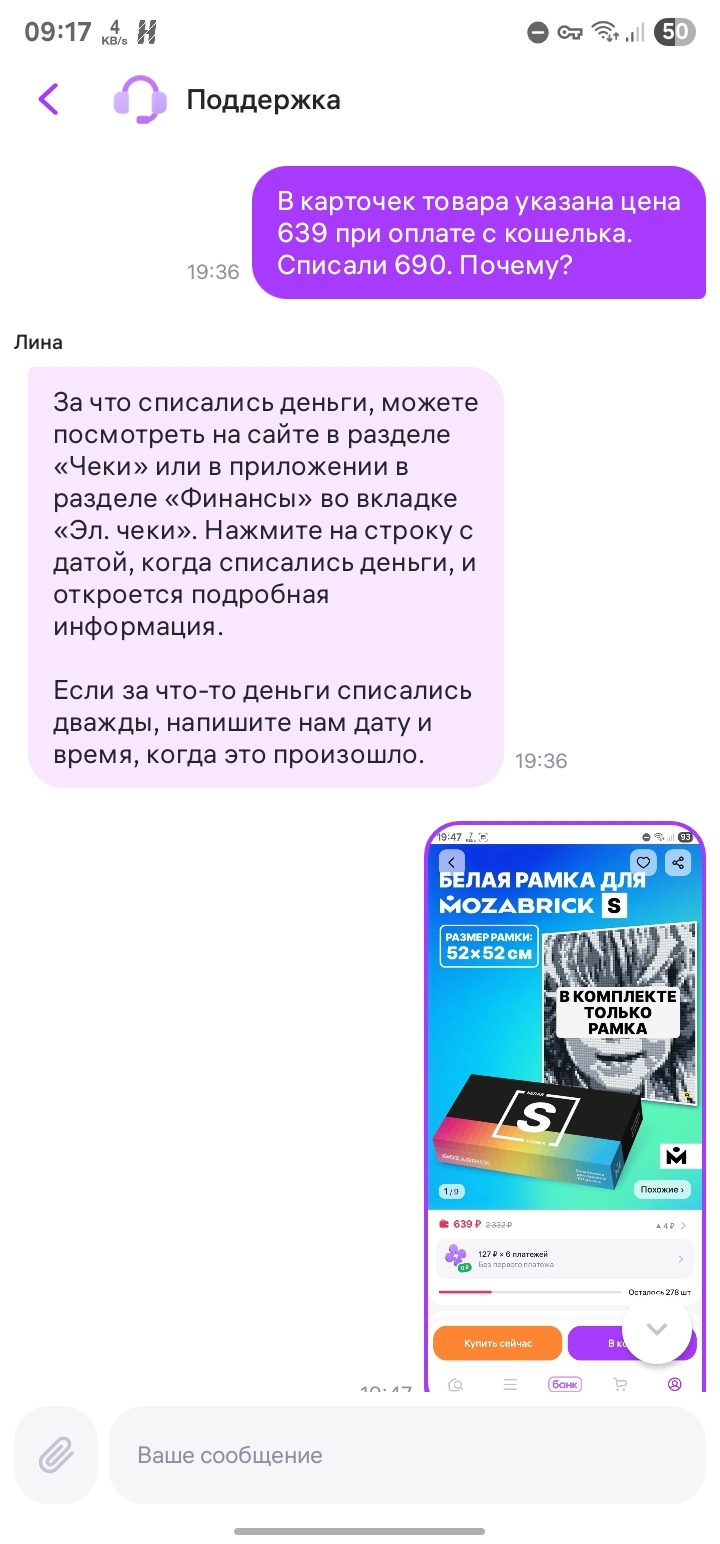 Пикантности добавляет тот факт, что при нехватке на счете wb даже рубля, цена пересчитывается без скидки и идет досписание с привязанной карты (уже далеко не рубля, в моем скромном случае плюсом прошло около 7% от стоимости). После Все попытки разобраться с поддержкой разбились о бота и бота второго уровня. Людей в поддержке похоже не осталось совсем.