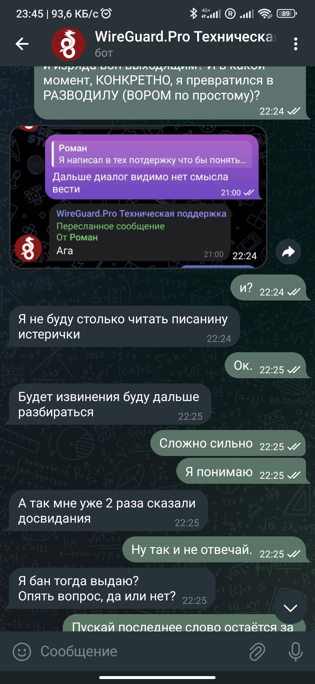 Суть истории в следующем: если собираетесь или уже пользуетесь прекрасной программой wireguard не заказывайте конфиги на этом ресурсе wireguard.pro. это их бот в телеге - @wireguardpro_bot. Ибо купить вы купите, и даже работать оно будет. Но если будет какой то сбой готовьте доказательную базу того что вы действительно купили у них что ли бо без нормальной обратной связи с админом и готовьтесь быть униженными на ровном месте, так как судя по всему у админа (мальчик на сколько я понял) почему то ПМС. Готовьтесь извиняться и падать ниц, так как этот мелкий пиздюк накрутил себе бигудей, мол он дофига начальник... Возможно я не прав, напишите об этом. Но себя такое поведение просто ставит в тупик. Не так часто в жизни попадаются такие кадры, но когда попадаются это нечто...