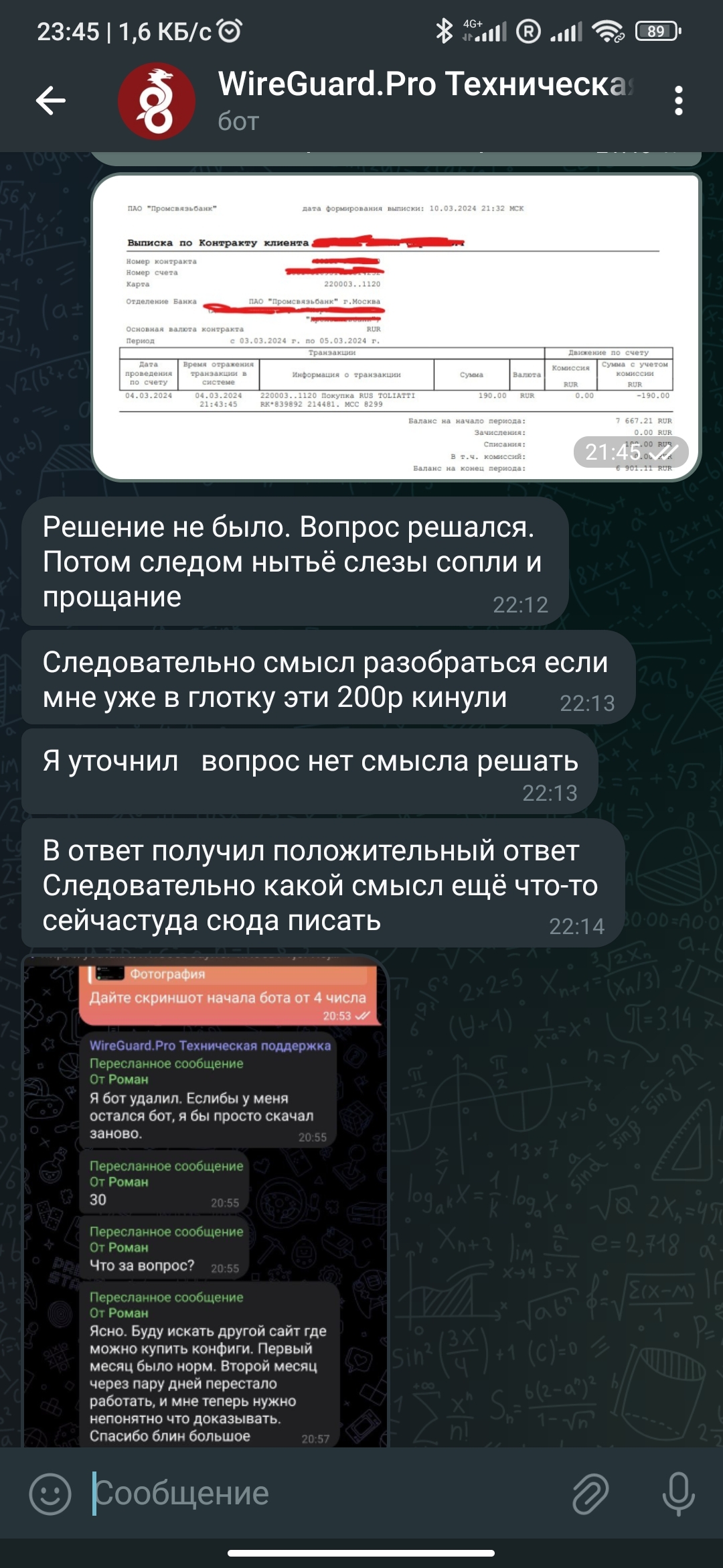 Для личных нужд было принято решение купить конфиг wireguard (vpn программа), ибо стандартные проги были для меня одним разочарованием. В поисках места где можно это сделать наткнулся на сайт (на мой взгляд грамотно сделан), с удобной системой оплаты и в целом меня полностью устраивал. Первый месяц все работало как часы. Вот на второй месяц начались проблемы. После покупки, практически сразу конфиг перестал работать. Обратился в тех поддержку почти неделю спустя, так как был занят другими делами. И каково было мое удивление когда я начал общаться со специалистом техпотдержки (он же и хозяин всей этой богадельни с его слов). Поначалу было все нормально, Я пытался доказать покупку на его требование (что вполне адекватно), но к сожалению у меня не было чека о покупке, ибо оплата происходила средствами перевода на что мой банк не даёт чеки, а лишь указываешь о списании в истории счета, что я ему и скинул в итоге (скриншоты с приложения банка). Будучи нормальным админом, он поднял бы за этот период переводы поступившие ему на кошелек и продублировал бы мне те защитные конфиги. Ну или по крайней мере вежливо послал бы в свободное пешое с намеком оплатить снова. Но нет.