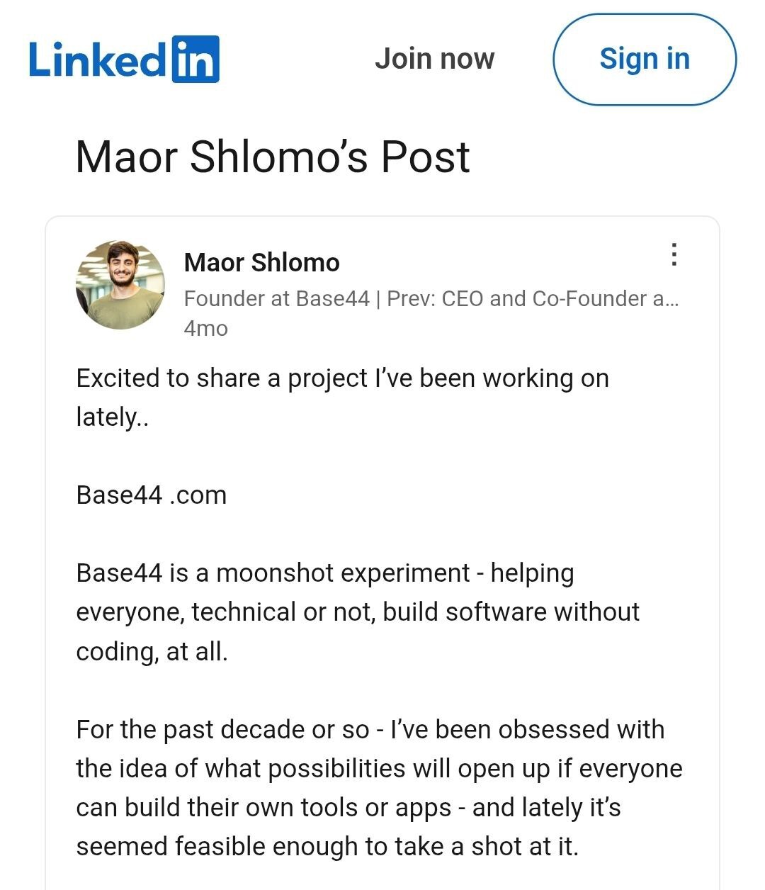 Стартап Base44 помогает разрабатывать приложения (тема на хайпе), и Маор сознательно собирал хайп с вайбкодинга, публикуя прогресс в Твиттере и на Линкедине.