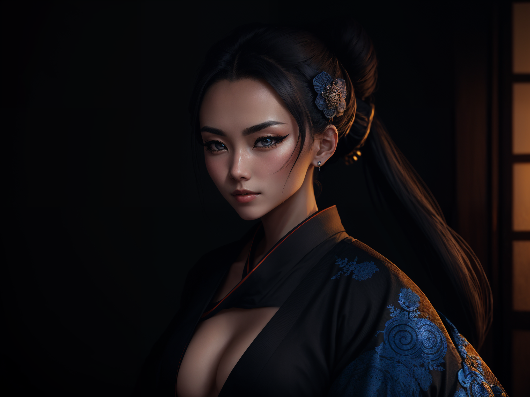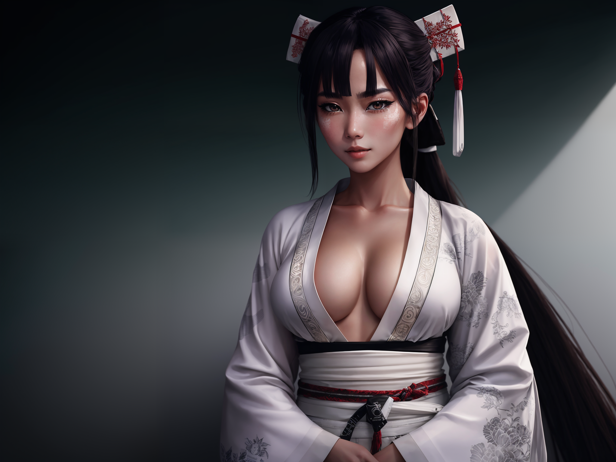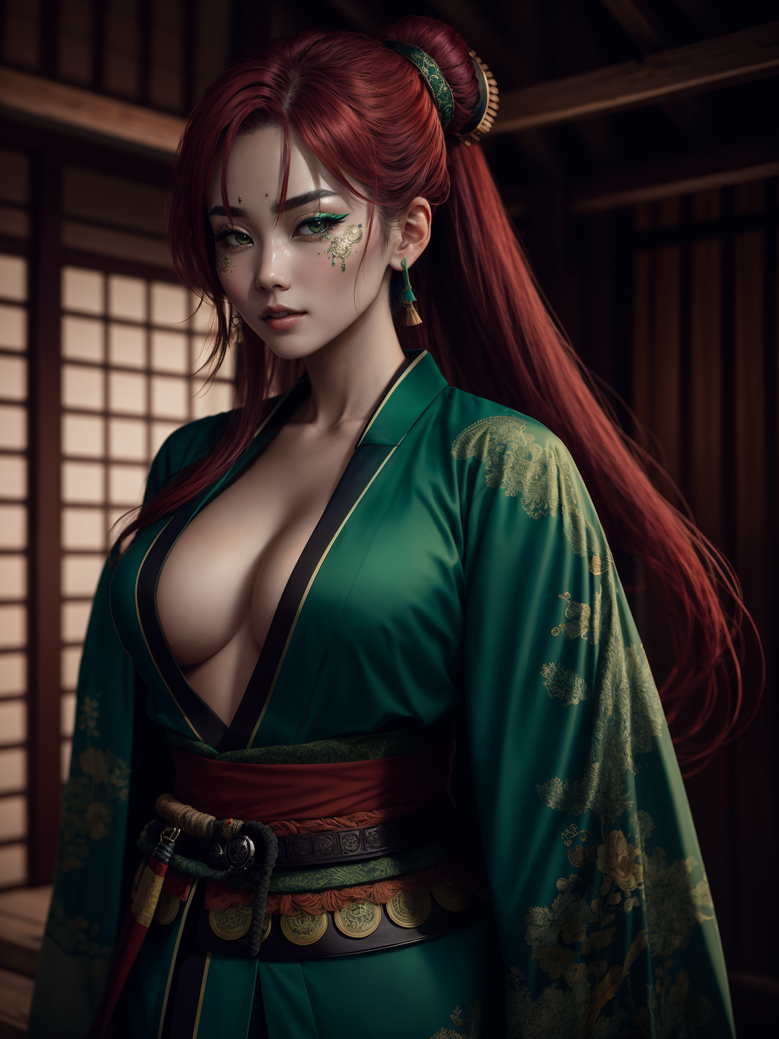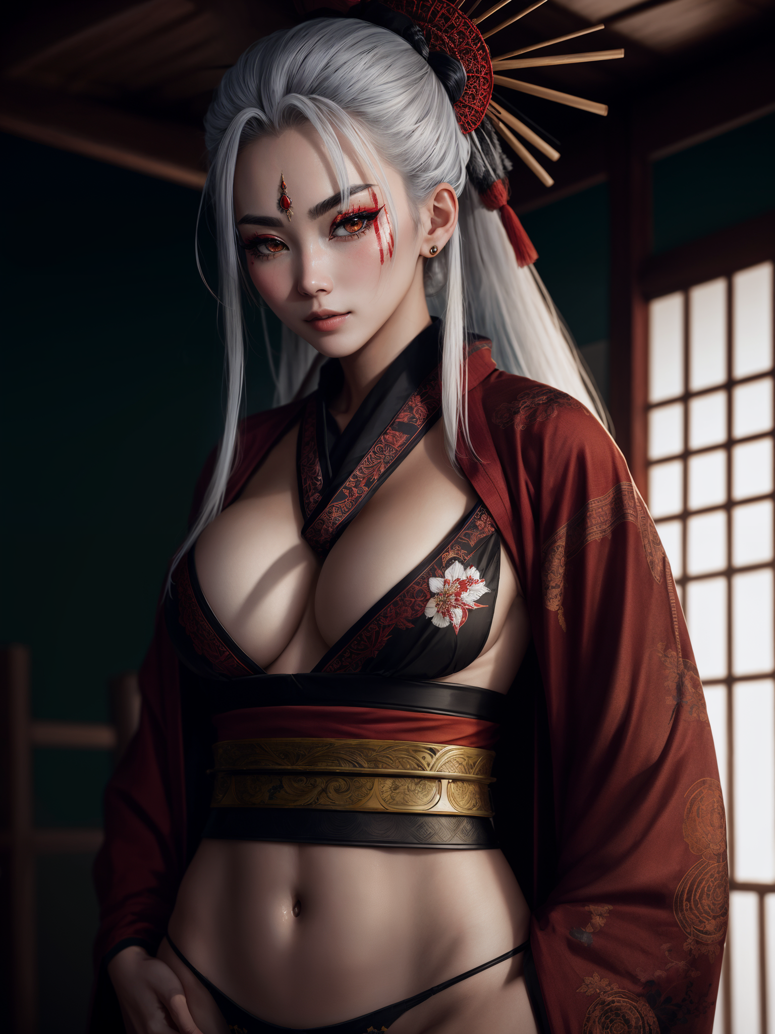 <lora:AISamuraiPunkAI:0.7>, SamuraiPunkAI samurai (1woman:1.5), underboobs, special force makeup, lean forward, sexy woman, lips parted, (red kimono:1.2), <lora:LowRA:0.7>, DARK THEME, sweat, small breast, green eyes, view above, long white hair, ((intricate details)), hdr, ((intricate details, hyperdetailed))