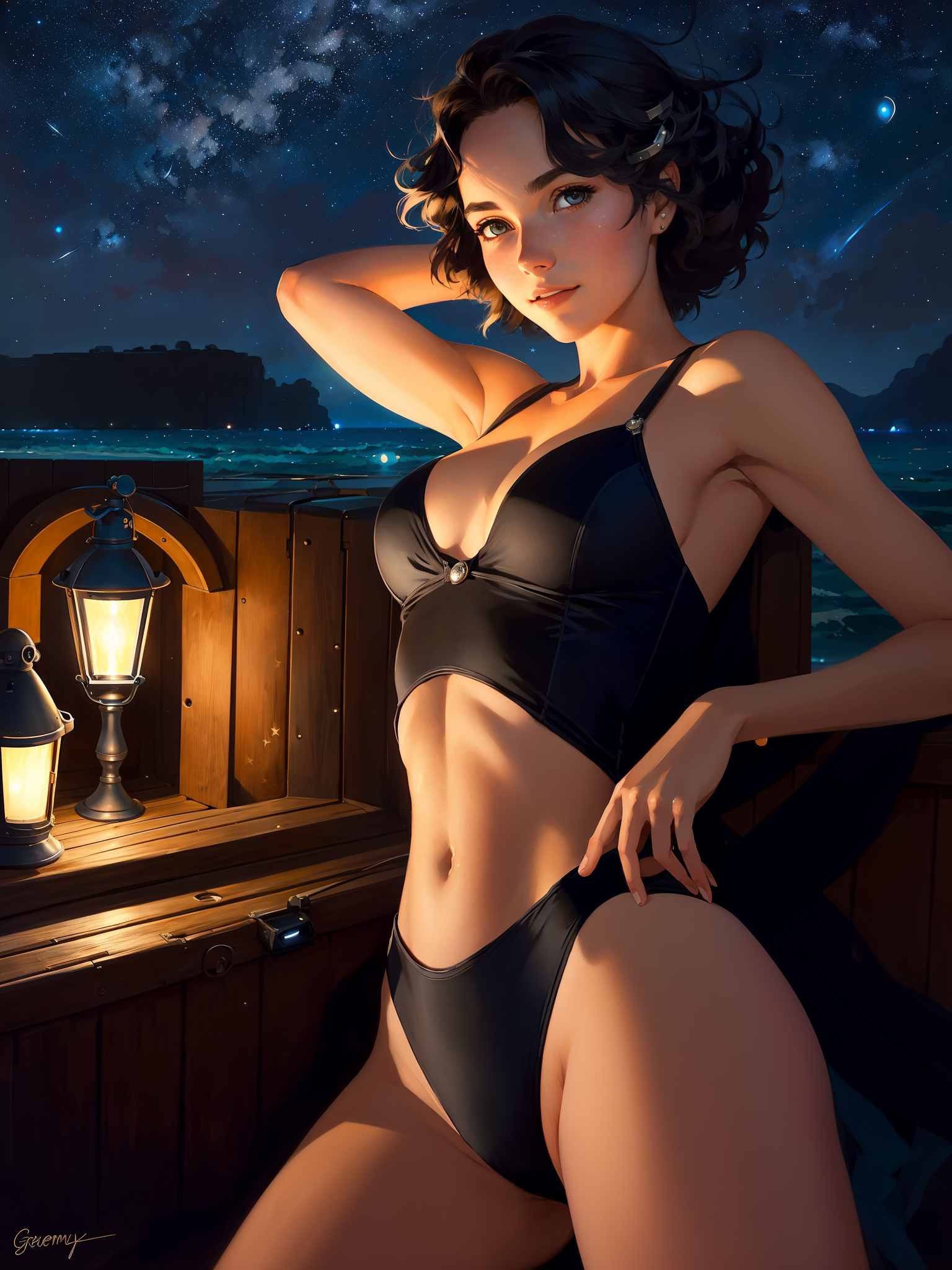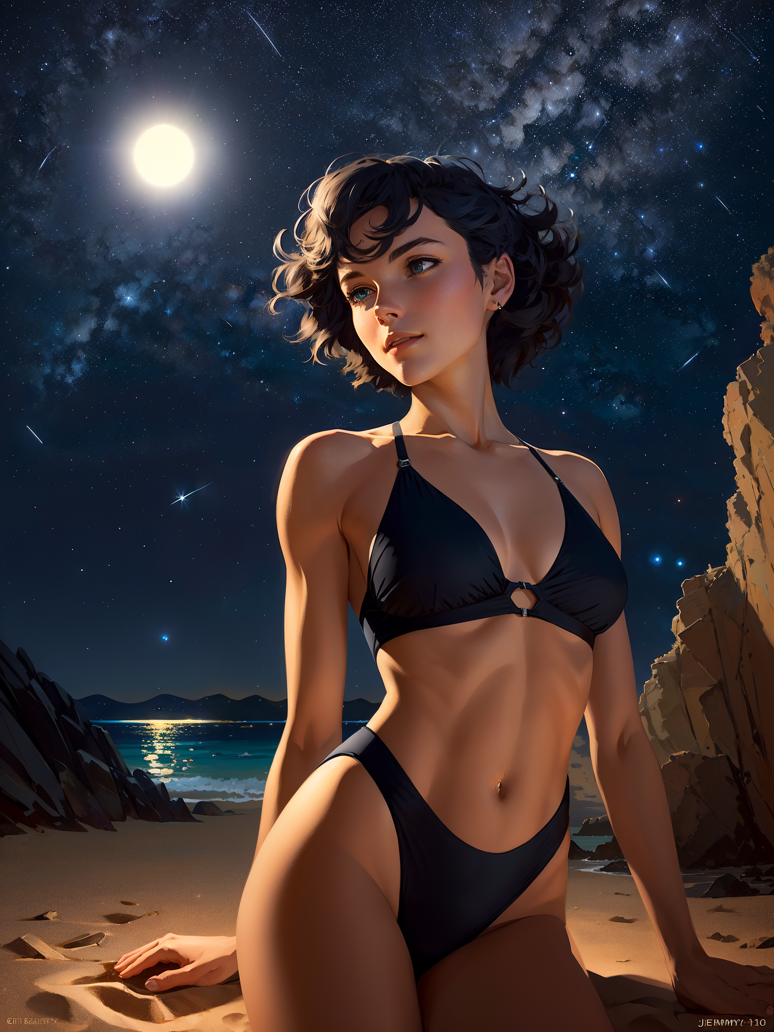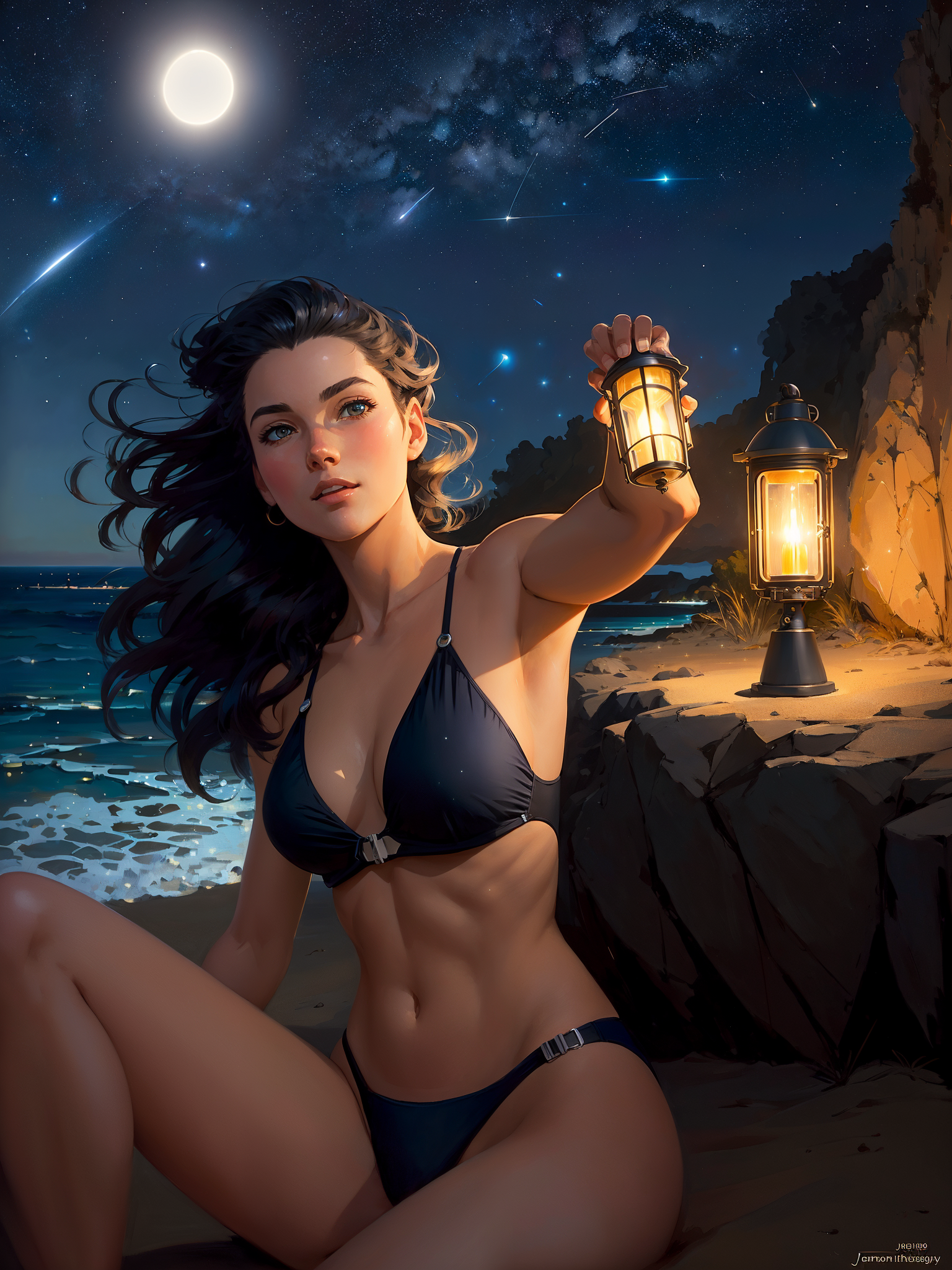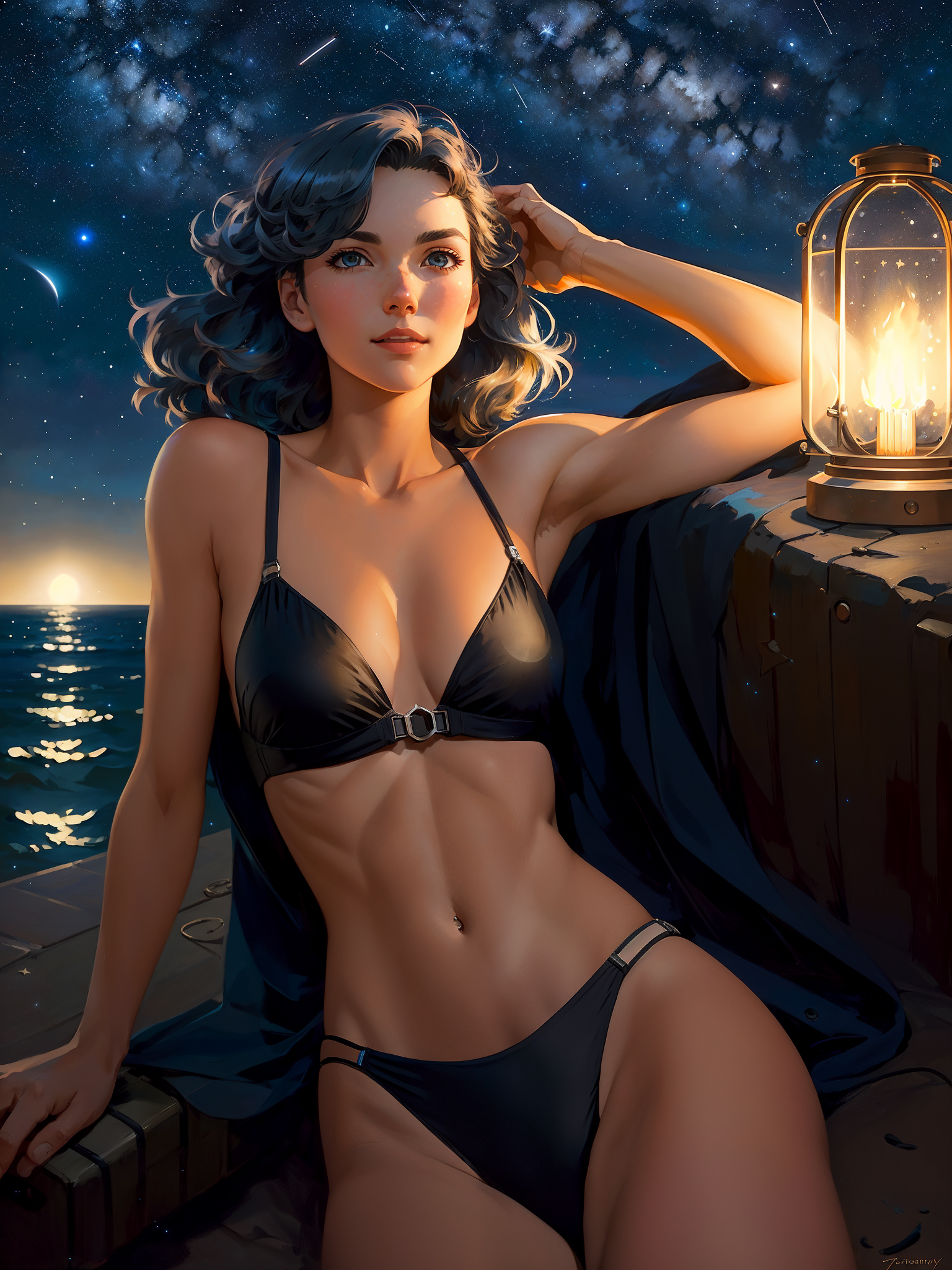a beautiful girl lies on the beach somewhere on the island, in a swimsuit, marine style , (at night:1.5), there is a pleasant light from torches around, the starry sky is clearly visible, there are stars and entire constellations with galaxies in the sky,