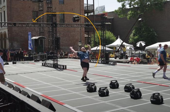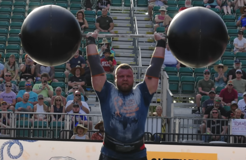 Третье упражнение - Overhead Medley. Эстафета из двух подъемов 90-килограмовой гантели над головой, 2 подъемов бревна над головой весом 145 кг, 2 подъема цирковой штанги весом 154 кг и 1 подъем акселя весом 168 кг, лимит - 75 секунд.