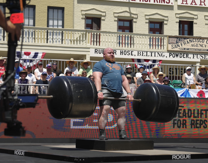 Второе упражнение - становая тяга 350кг на количество раз, ограничение времени - минута. Райно выполнил 8 повторений