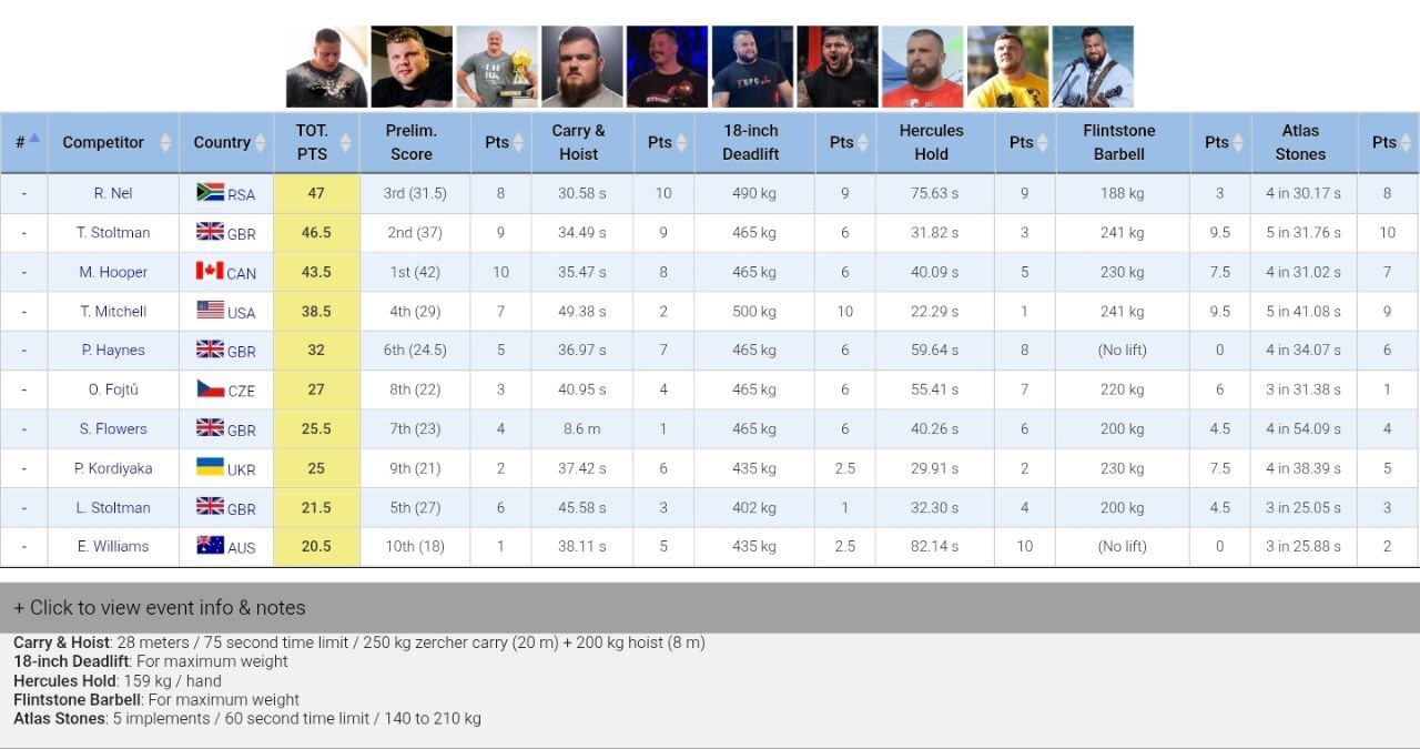 Итоговая таблица и результаты группового этапа - https://www.strongmanarchives.com/viewContest.php?id=1610