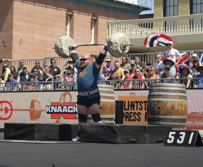 Третье задание финала - жим "Флинстоуна" на максимум. Цель - поднять максимальный вес над головой, здесь Райно покорились 188кг.
