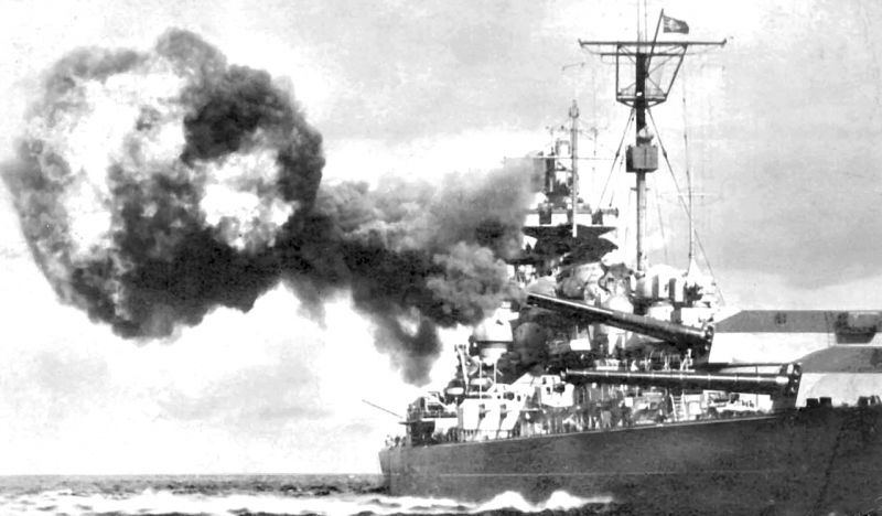 Выстрел из 381-мм орудий ГК башни №3 «Цезарь» линкора Tirpitz, 1941 год, Балтийское море. Заметна отличительная особенность — башни корабля в верхней части окрашены в красный цвет