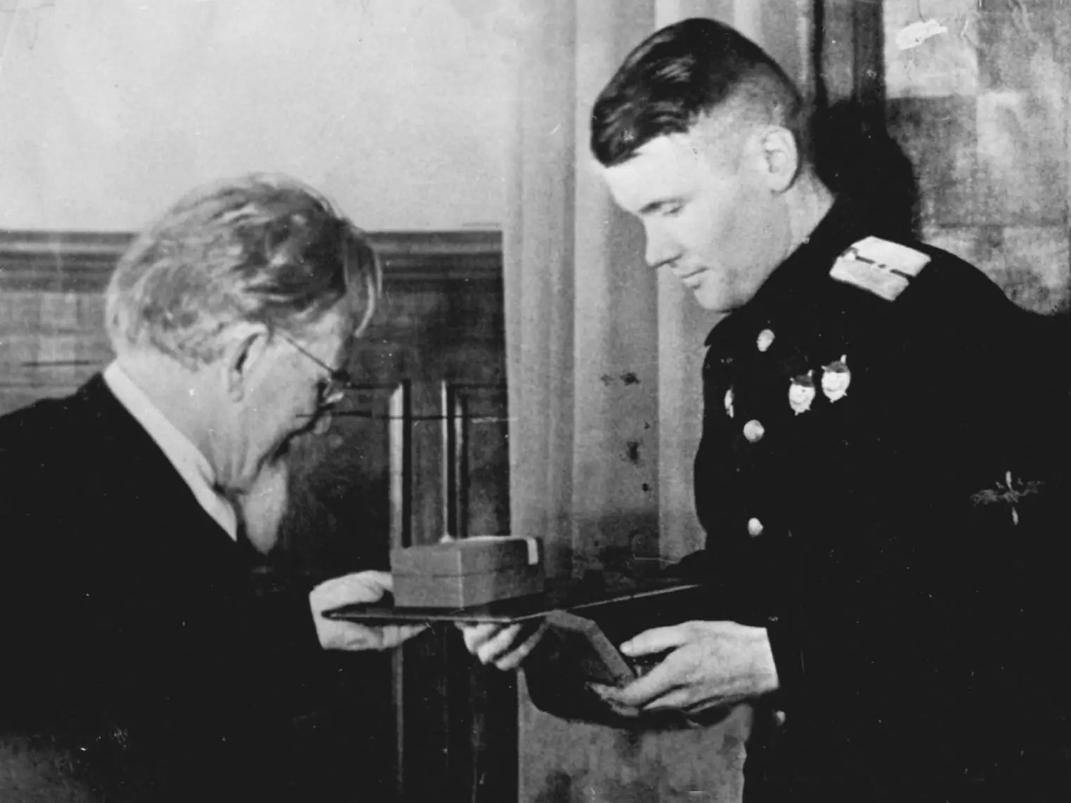 «Дедушка Калинин» вручает Леониду Елькину звезду Героя Советского Союза, 10 февраля 1944 года. Всего через 10 дней Елькин не вернётся с боевой разведки Северной Норвегии. Погиб при невыясненных обстоятельствах