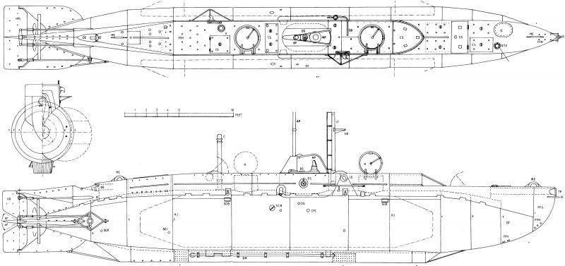 Схематичное изображение сверхмалой субмарины типа X. Водоизмещение в подводном положении — 29,7 (некоторые источники указывают 35) тонн, длина составляла 15,8 метров, а ширина — 1,8 метров, скорость экономичного хода не превышала 4,5 узла
