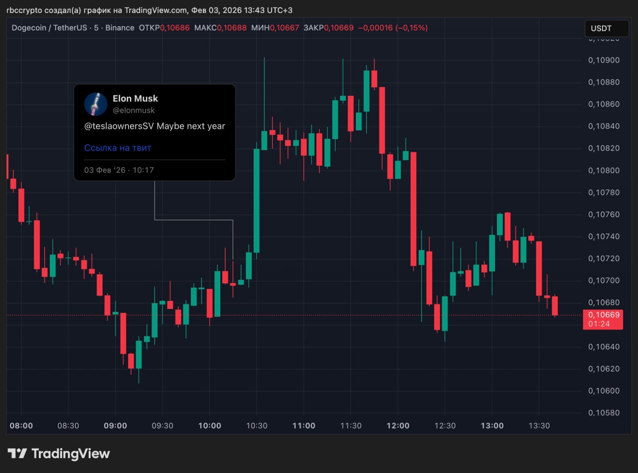 В ходе обсуждения слияния xAI и SpaceX Маск ответил одному из подписчиков, что возможно в следующем году «отправит Dogecoin на Луну». После его ответа курс DOGE подскочил на 2%, но быстро вернулся к прежним значениям.