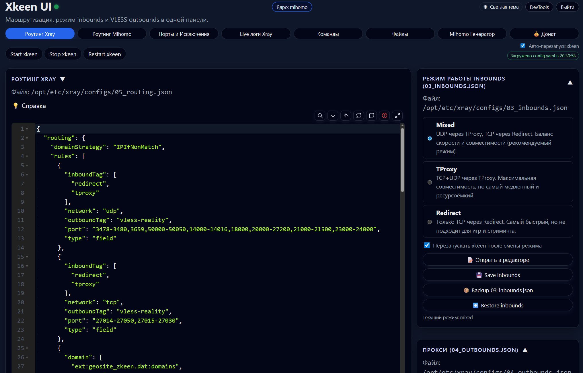 Сначала задумывалась, как быстрый редактор конфигураций. Потом Остапа понесло, теперь в панели есть мощный двухпанельный файловый менеджер, полноценный терминал, редакторы роутинга с локальным CodeMirror и генератор конфигов Mihomo.