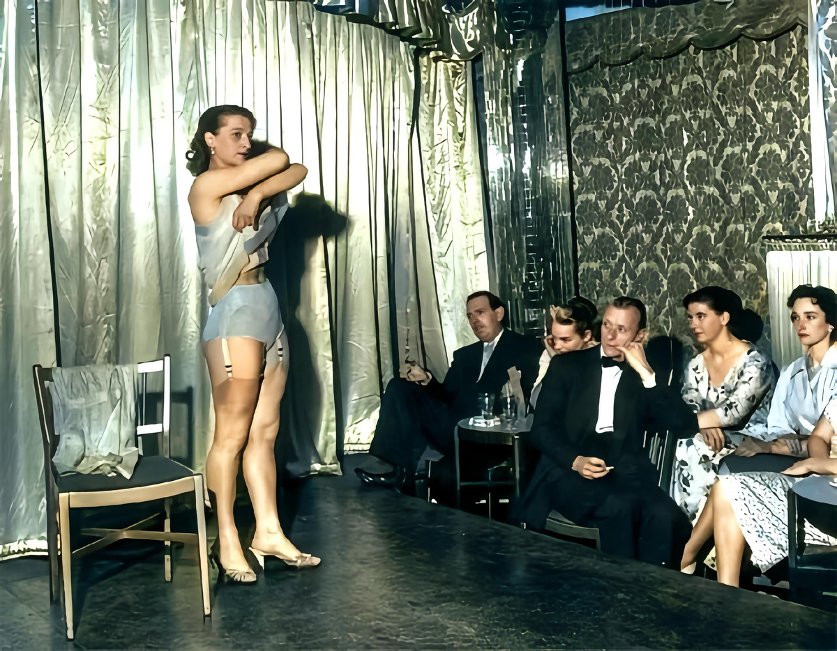 В 1958 году в Лондоне открылось первое заведение с эротическими шоу, замаскированное под частный клуб, что формально выводило шоу из-под действия законов о публичной морали. В отличие от французских кабаре, здесь не было роскоши: деревянные стулья, строгие смокинги у посетителей и каменные выражения лиц у всех. Вероятно, внешняя чопорность скрывала бурю эмоций... )))